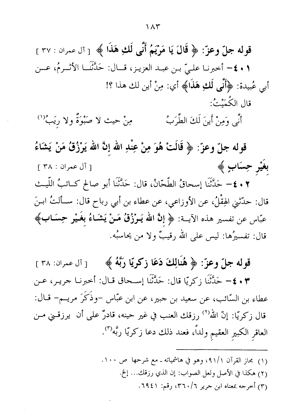 401 - أَخْبَرَنَا علي بْن عَبْد العزيز، قَالَ: حَدَّثَنَا الأثرم، عَنْ أبي عبيدة: {أَنَّى لَكِ هَذَا} ، أي: من أين لك هَذَا قَالَ الكميت: أنى ومن أين لك الطرب من حيث لا صبوة وَلا ريب