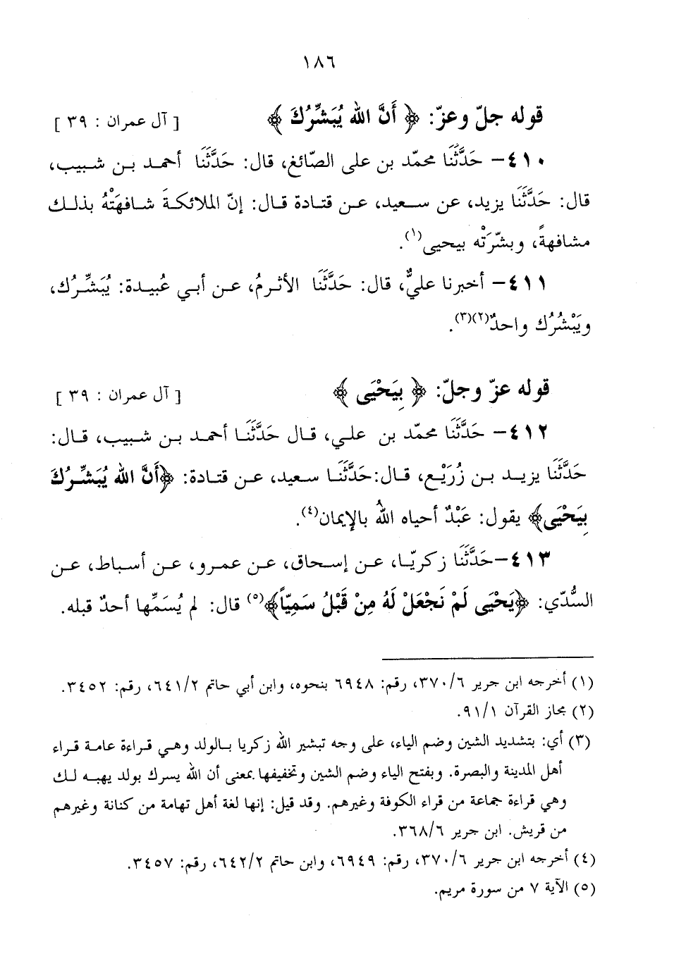 412 - حَدَّثَنَا محمد بْن علي، قَالَ: حَدَّثَنَا أحمد بْن شبيب، قَالَ: حَدَّثَنَا يزيد بْن زريع، قَالَ: حَدَّثَنَا سعيد، عَنْ قتادة، قوله جَلَّ وَعَزَّ: {أَنَّ اللهَ يُبَشِّرُكَ بِيَحْيَى} يقول: " عَبْد أحياه الله بالإيمان
