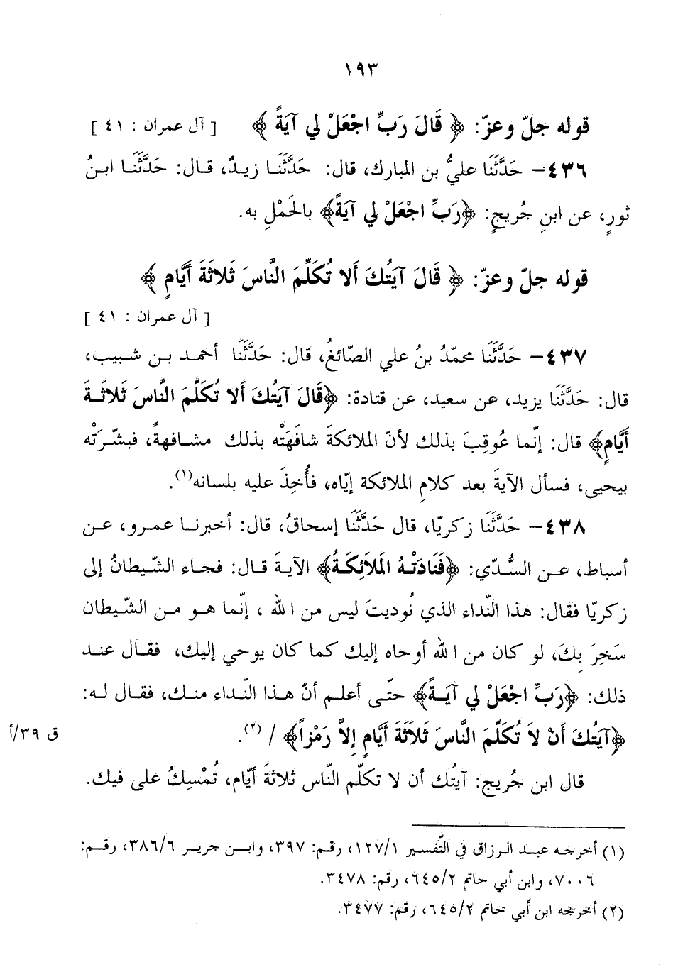 438 - حَدَّثَنَا زَكَرِيَّا، قَالَ: حَدَّثَنَا إِسْحَاق، قَالَ: أَخْبَرَنَا عمرو، عَنْ أسباط، عَنْ السدي: {فَنَادَتْهُ الْمَلائِكَةُ} الآيَة قَالَ " فجاء الشيطان إِلَى زَكَرِيَّا فَقَالَ: هَذَا النداء الَّذِي نوديت لَيْسَ مِنَ اللهِ، إِنَّمَا هُوَ من الشيطان سخر بك لو كَانَ مَا الله أوحاه إِلَيْكَ مَا كَانَ يوحي إِلَيْكَ، فَقَالَ عِنْد ذَلِكَ: {رَبِّ اجْعَلْ لِي آيَةً} حَتَّى أعلم أن هَذَا النداء منك، فَقَالَ لَهُ: {قَالَ آيَتُكَ أَلَّا تُكَلِّمَ النَّاسَ ثَلاثَةَ أَيَّامٍ إِلا رَمْزًا} " قَالَ ابْن جريج: " آيتك أن لا تكلم النَّاس ثلاثة أيام تمسك عَلَى فيك