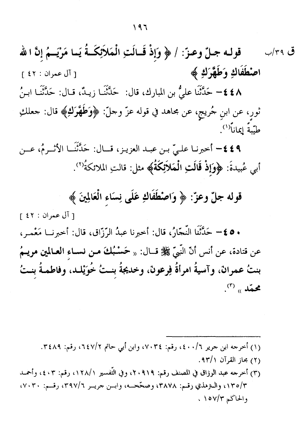 450 - حَدَّثَنَا النَّجَّارُ، قَالَ: أَخْبَرَنَا عَبْدُ الرَّزَّاقِ، قَالَ: أَخْبَرَنَا مَعْمَرٌ، عَنْ قَتَادَةَ، عَنْ أَنَسٍ، أَنَّ النَّبِيَّ صَلَّى اللَّهُ عَلَيْهِ وَسَلَّمَ، قَالَ: " حَسْبُكَ مِنْ نِسَاءِ الْعَالِمِينَ مَرْيَمُ بِنْتُ عِمْرَانَ، وَآسِيَةُ امْرَأَةُ فِرْعَوْنَ، وَخَدِيجَةُ بِنْتُ خُوَيْلِدٍ، وَفَاطِمَةُ بِنْتُ مُحَمَّدٍ "