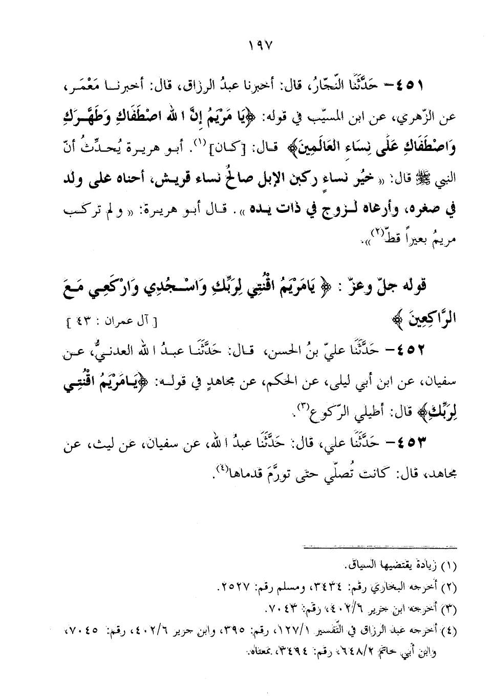 451 - حَدَّثَنَا النَّجَّارُ، قَالَ: أَخْبَرَنَا عَبْدُ الرَّزَّاقِ، قَالَ: أَخْبَرَنَا مَعْمَرٌ، عَنِ الزُّهْرِيِّ، عَنِ ابْنِ الْمُسَيِّبِ، فِي قوله: {يَا مَرْيَمُ إِنَّ اللهَ اصْطَفَاكِ وَطَهَّرَكِ وَاصْطَفَاكِ عَلَى نِسَاءِ الْعَالَمِينَ} قَالَ: كَانَ أبو هريرة يحدث أن النَّبِيّ صَلَّى اللَّهُ عَلَيْهِ وَسَلَّمَ، قَالَ: " خَيْرُ نِسَاءٍ رَكِبْنَ الإِبِلَ صَالِحُ نِسَاءِ قُرَيْشٍ، أَحْنَاهُ عَلَى وَلَدٍ فِي صِغَرِهِ، وَأَرْعَاهُ لِزَوْجٍ ذَاتِ يَدِهِ "، قَالَ أبو هريرة: وَلَمْ تَرْكَبْ مَرْيَمُ بَعِيرًا قَطُّ