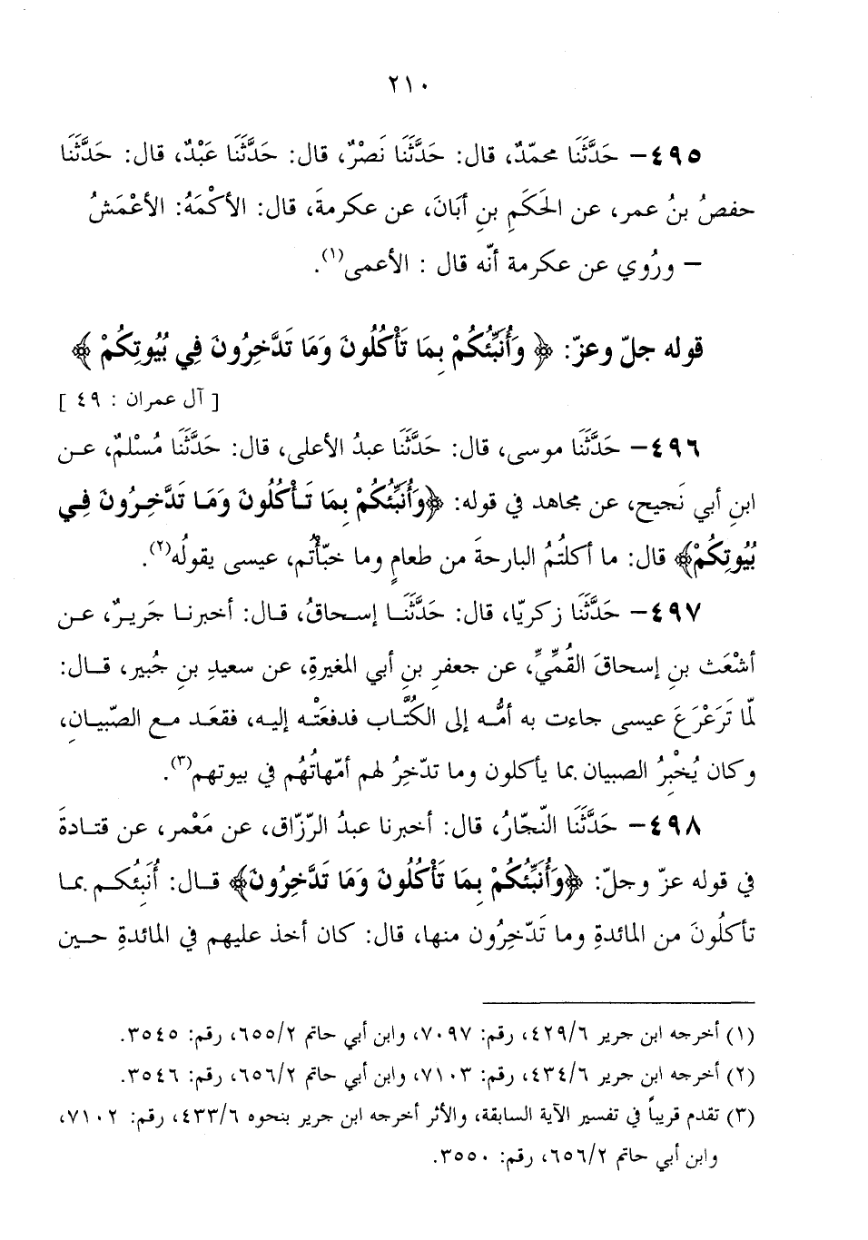 496 - حَدَّثَنَا موسى، قَالَ: حَدَّثَنَا عَبْد الأعلى، قَالَ: حَدَّثَنَا مسلم، عَنْ ابْن نجيح، عَنْ مجاهد، فِي قوله: {وَأُنَبِّئُكُمْ بِمَا تَأْكُلُونَ وَمَا تَدَّخِرُونَ فِي بُيُوتِكُمْ} قَالَ " مَا أكلتم البارحة من طعام، وَمَا خبأتم عِيسَى يقوله