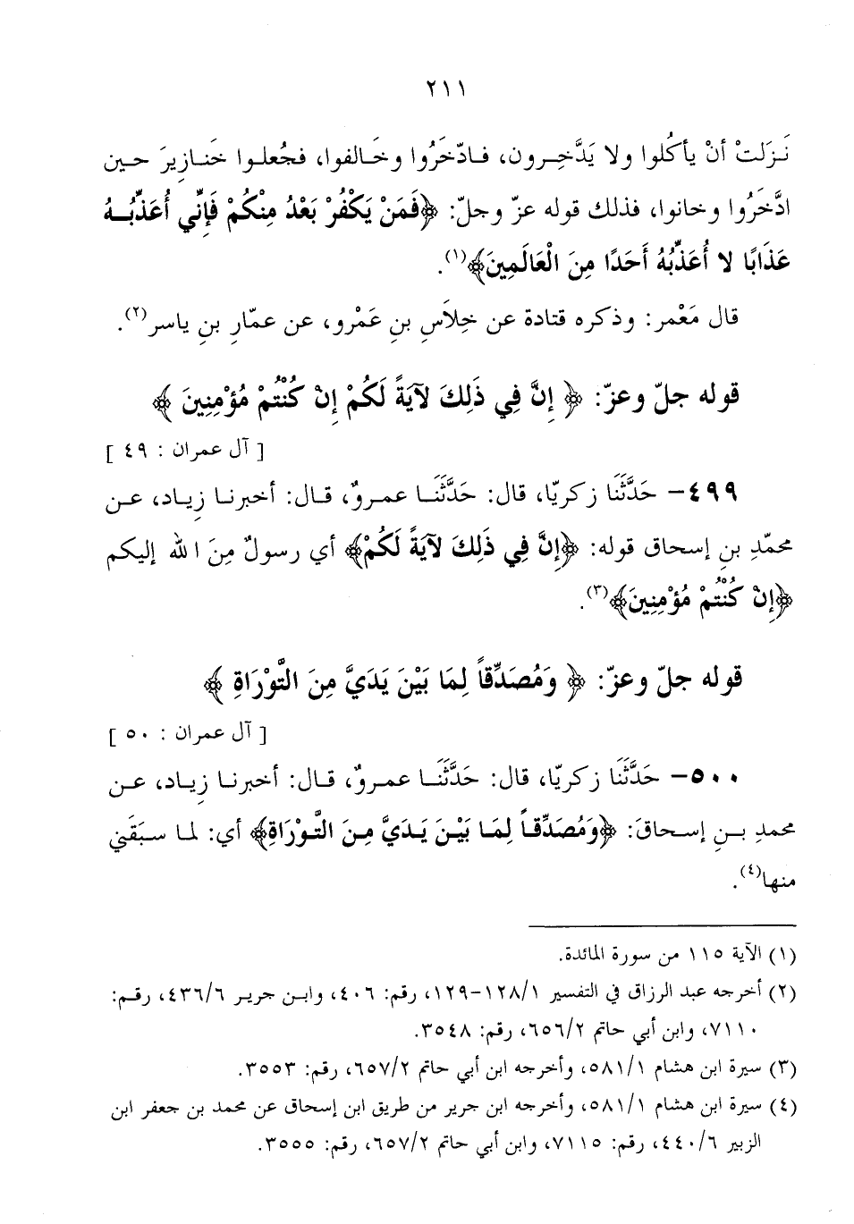 500 - حَدَّثَنَا زَكَرِيَّا، قَالَ: حَدَّثَنَا عمرو، قَالَ: أَخْبَرَنَا زياد، عَنْ محمد بْن إِسْحَاق: {وَمُصَدِّقًا لِمَا بَيْنَ يَدَيَّ مِنَ التَّوْرَاةِ} أي " لما سبقني مِنْهَا