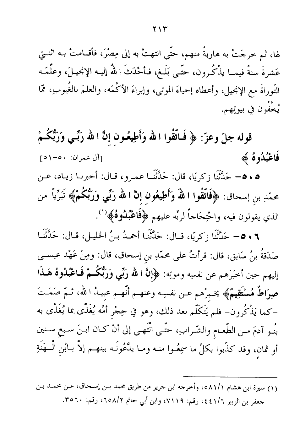 506 - حَدَّثَنَا زَكَرِيَّا، قَالَ: حَدَّثَنَا أحمد بْن الخليل، قَالَ: حَدَّثَنَا صدقة بْن سابق، قَالَ: قرأت عَلَى محمد بْن إِسْحَاق، قَالَ: ومن عهد عِيسَى إليهم حين أخبرهم عَنْ نفسه، وموته: {إِنَّ اللهَ رَبِّي وَرَبُّكُمْ فَاعْبُدُوهُ هَذَا صِرَاطٌ مُسْتَقِيمٌ} عَنْ نفسه وعنهم، أنهم عبيد الله، ثُمَّ صمت كَمَا يذكرون، فلم يتكلم بعد ذَلِكَ، وَهُوَ فِي حجر أمه يغذي بما يغذي بِهِ بنو آدم من الطعام والشراب، حَتَّى انتهى إِلَى أن كَانَ ابْن سبع سنين أَوْ ثمان، وقد كذبوا بكل مَا سمعوا مِنْهُ، وَمَا يدعونه بينهم إِلا بابن الهنة