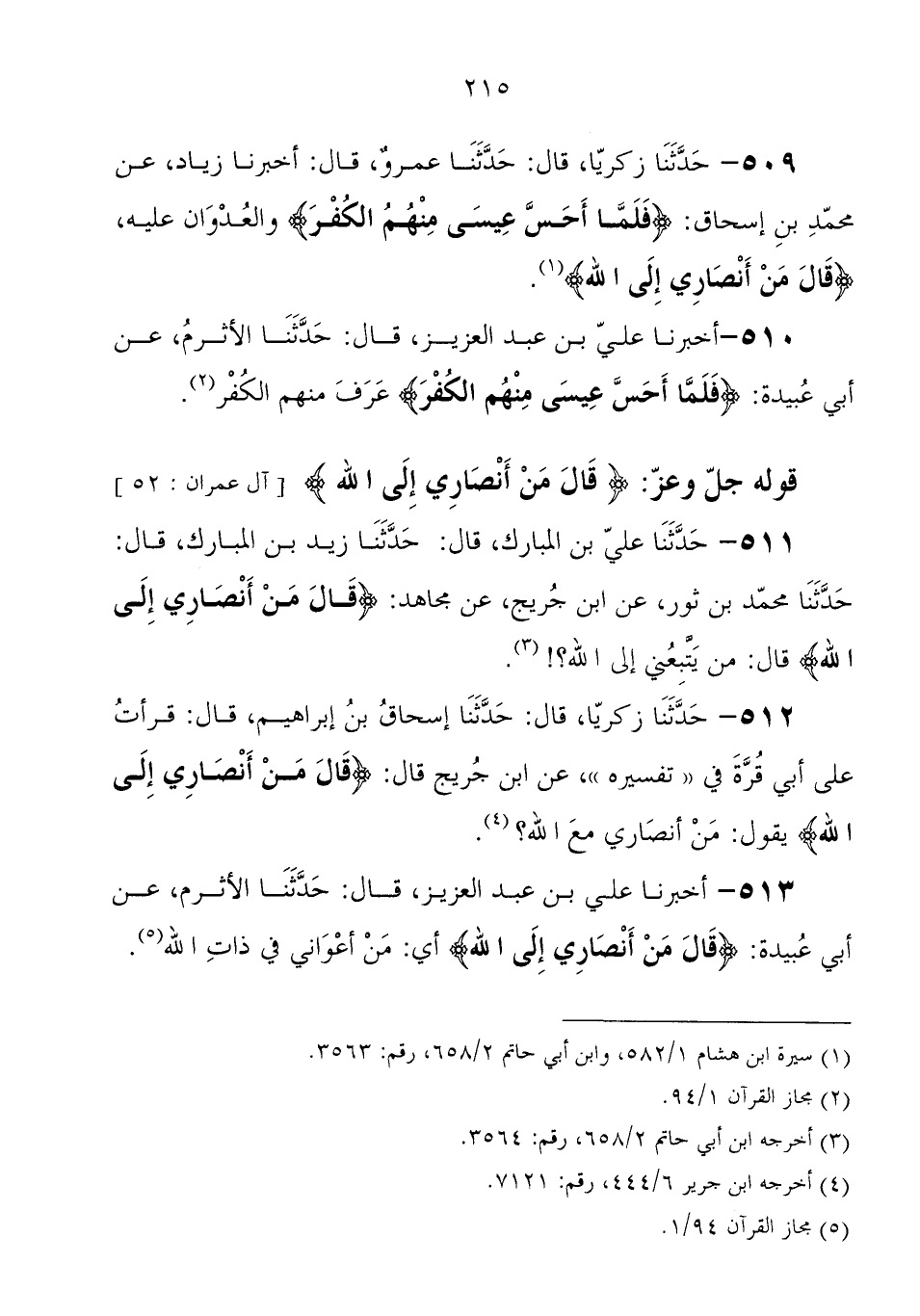 512 - حَدَّثَنَا زَكَرِيَّا، قَالَ: حَدَّثَنَا إِسْحَاق بْن إِبْرَاهِيمَ، قَالَ: قرأت عَلَى أبي قرة، فِي تفسيره، عَنْ أبن جريج، قَالَ: {قَالَ مَنْ أَنْصَارِي إِلَى اللهِ} يقول: " من أنصاري مع الله "؟