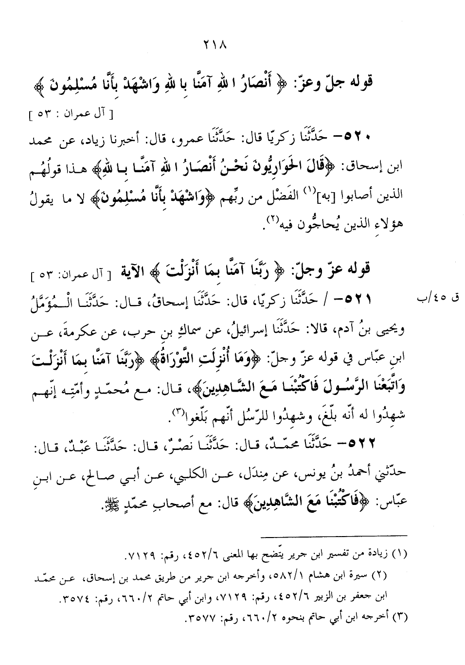 520 - حَدَّثَنَا زَكَرِيَّا، قَالَ: حَدَّثَنَا عمرو، قَالَ: أَخْبَرَنَا زياد، عَنْ محمد ابْن إِسْحَاق: {قَالَ الْحَوَارِيُّونَ نَحْنُ أَنْصَارُ اللهِ آمَنَّا بِاللهِ} هَذَا قولهم " الذين أصابوا بِهِ الفضل من ربهم {وَاشْهَدْ بِأَنَّا مُسْلِمُونَ} لا مَا يقول هؤلاء الذين يحاجون فِيهِ "