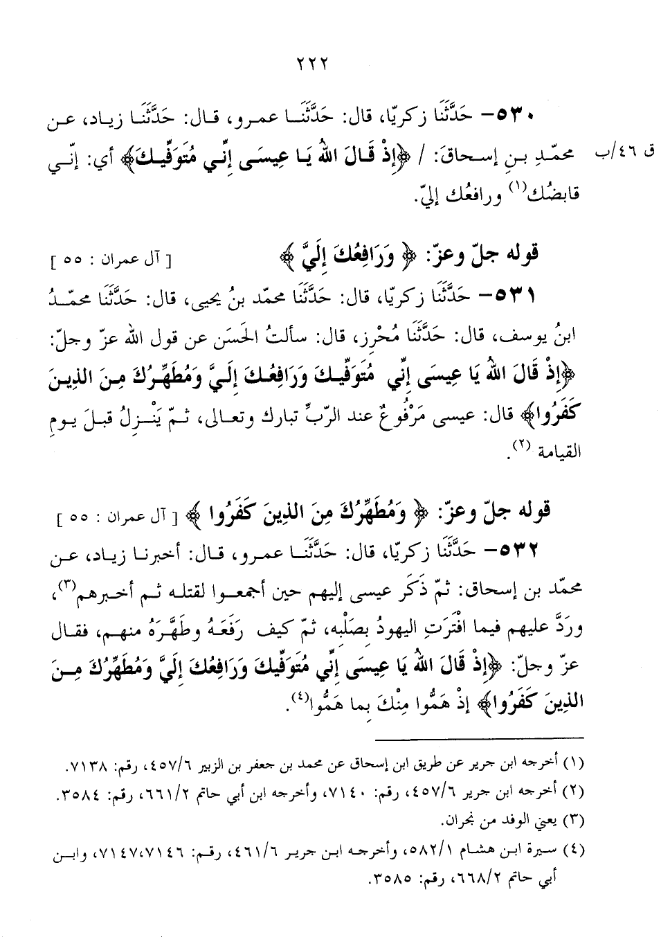 532 - حَدَّثَنَا زَكَرِيَّا، قَالَ: حَدَّثَنَا عمرو، قَالَ: أَخْبَرَنَا زياد، عَنْ محمد بْن إِسْحَاق، " ثُمَّ ذكر عِيسَى إليهم حين أجمعوا لقتله، ثُمَّ أخبرهم ورد عَلَيْهِمْ فيما افترت اليهود بصلبه، ثُمَّ كيف رفعه، وطهره منهم، فَقَالَ عَزَّ وَجَلَّ: {إِذْ قَالَ اللهُ يَا عِيسَى إِنِّي مُتَوَفِّيكَ وَرَافِعُكَ إِلَيَّ وَمُطَهِّرُكَ مِنَ الَّذِينَ كَفَرُوا} " إذ هموا منك بما هموا "