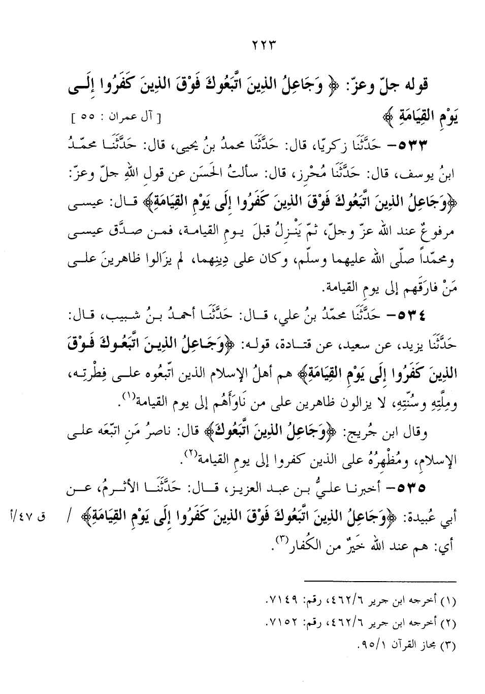 534 - حَدَّثَنَا محمد بْن علي، قَالَ: حَدَّثَنَا أحمد بْن شبيب، قَالَ: حَدَّثَنَا يزيد، عَنْ سعيد، عَنْ قتادة، قوله: {وَجَاعِلُ الَّذِينَ اتَّبَعُوكَ فَوْقَ الَّذِينَ كَفَرُوا إِلَى يَوْمِ الْقِيَامَةِ} " هم أَهْل الإسلام الذين اتبعوه عَلَى فطرته، وملته، وسنته، لا يزالون ظاهرين عَلَى من ناوأهم إِلَى يَوْم الْقِيَامَةِ " وَقَالَ ابْن جريج {وَجَاعِلُ الَّذِينَ اتَّبَعُوكَ} قَالَ: " ناصر من اتبعه عَلَى الإسلام، ومظهره عَلَى الذين كفروا إِلَى يَوْم الْقِيَامَةِ "