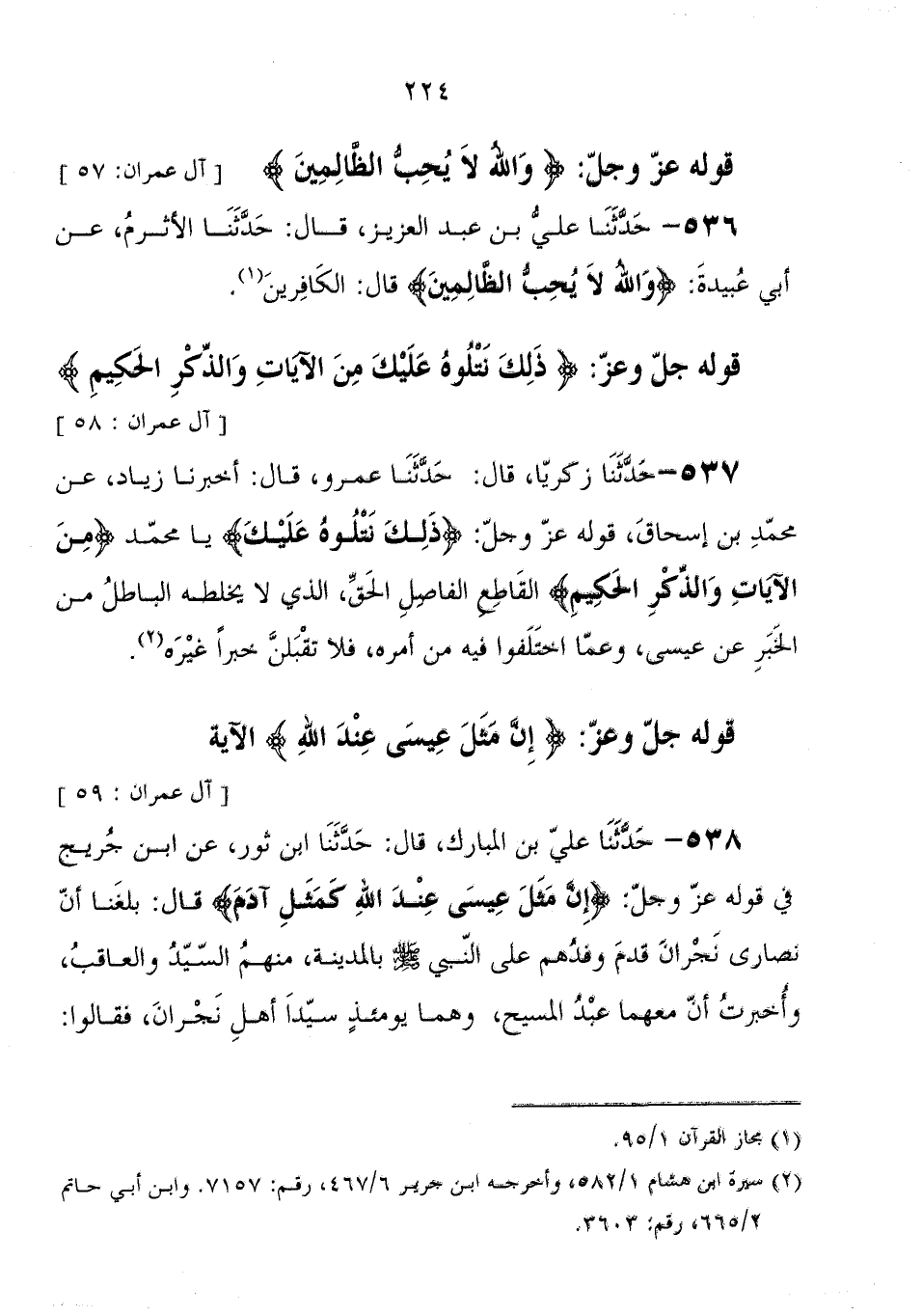 538 - حَدَّثَنَا عَلِيُّ بْنُ الْمُبَارَكِ، قَالَ: حَدَّثَنَا ابْنُ ثَوْرٍ، عَنِ ابْنِ جُرَيْجٍ، فِي قوله جَلَّ وَعَزَّ: " {إِنَّ مَثَلَ عِيسَى عِنْدَ اللهِ كَمَثَلِ آدَمَ} قَالَ: بَلَغَنَا أَنَّ نَصَارَى نَجْرَانَ قَدِمَ وَفْدُهُمْ عَلَى النَّبِيِّ صَلَّى اللَّهُ عَلَيْهِ وَسَلَّمَ بِالْمَدِينَةِ مَنْهُمُ السَّيِّدُ، وَالْعَاقِبُ، وَأُخْبِرْتُ أَنَّ مَعَهُمَا عَبْدُ الْمَسِيحِ، وَهُمَا يَوْمَئِذٍ سَيِّدَا أَهْلِ نَجْرَانَ، فَقَالُوا: