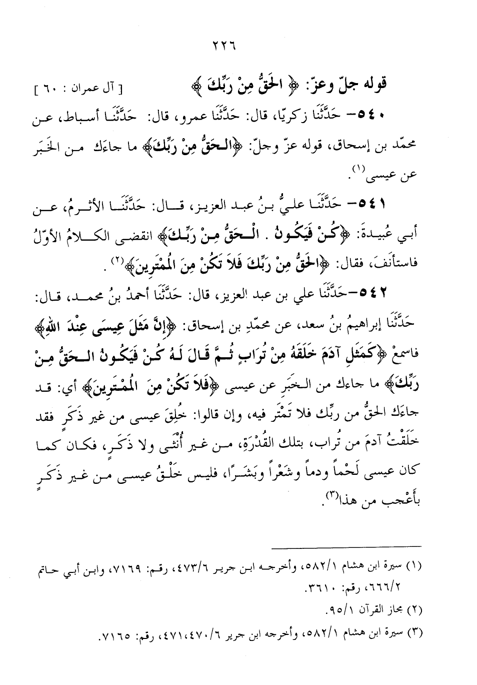 542 - حَدَّثَنَا علي بْن عَبْد العزيز، قَالَ: حَدَّثَنَا أحمد بْن محمد، قَالَ: حَدَّثَنَا إبراهيم بْن سعد، عَنْ محمد بْن إِسْحَاق: إِنَّ مَثَلَ عِيسَى عِنْدَ اللهِ فاسمع كَمَثَلِ آدَمَ خَلَقَهُ مِنْ تُرَابٍ ثُمَّ قَالَ لَهُ كُنْ فَيَكُونُ الْحَقُّ مِنْ رَبِّكَ - مَا جاءك من الخبر، عَنْ عِيسَى فَلا تَكُنْ مِنَ الْمُمْتَرِينَ أي " قَدْ جاءك الحق من ربك فلا تمتر فِيهِ، وإن قَالُوا: خلق عِيسَى من غير ذكر، فقد خلقت آدم من تراب بتلك القدرة من غير أنثى وَلا ذكر، فَكَانَ كَمَا كَانَ عِيسَى لحما ودما وشعرا وبشرا، فليس خلق عِيسَى من غير ذكر بأعجب من هَذَا "