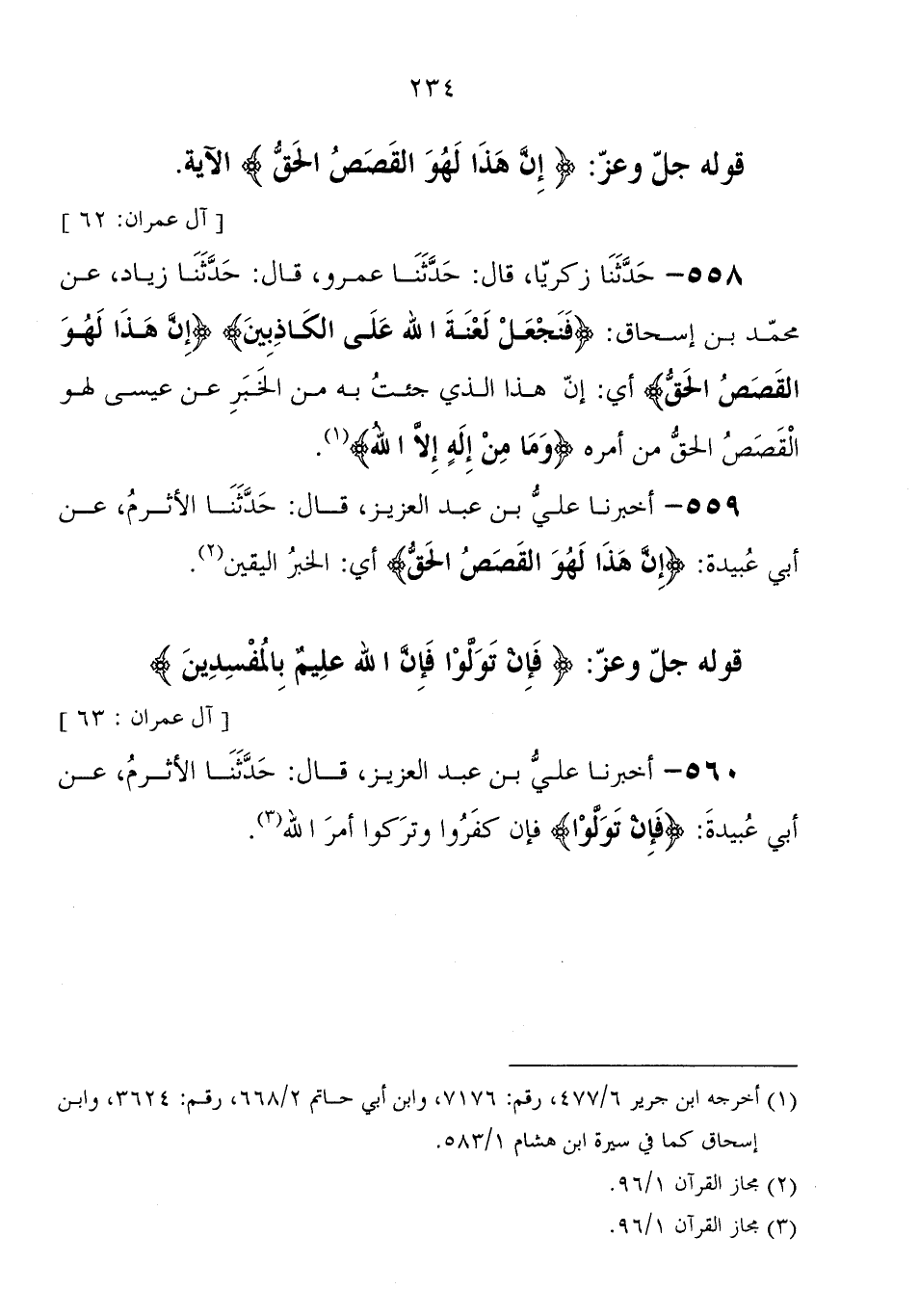 558 - حَدَّثَنَا زَكَرِيَّا، قَالَ: حَدَّثَنَا عمرو، قَالَ: حَدَّثَنَا زياد، عَنْ محمد بْن إِسْحَاق: {فَنَجْعَلْ لَعْنَةَ اللهِ عَلَى الْكَاذِبِينَ} {إِنَّ هَذَا لَهُوَ الْقَصَصُ الْحَقُّ} أي " إن هَذَا الَّذِي جئت بِهِ من الخبر عَنْ عِيسَى لهو القصص الحق من أمره {وَمَا مِنْ إِلَهٍ إِلا اللهُ} "