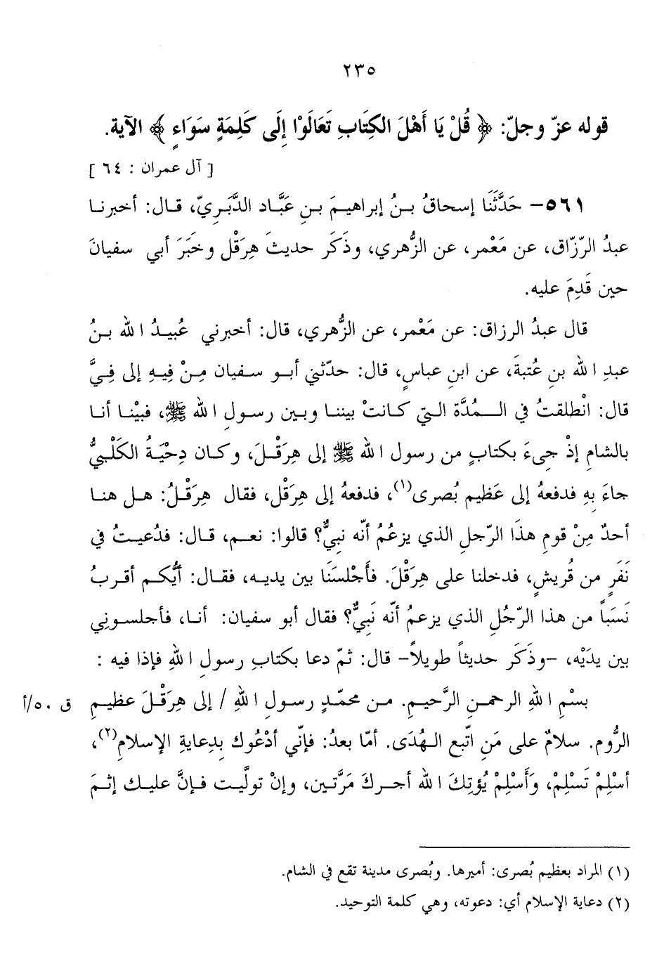 561 - حَدَّثَنَا إِسْحَاقُ بْنُ إِبْرَاهِيمَ بْنِ عَبَّادٍ الدَّبَرِيُّ، قَالَ: أَخْبَرَنَا عَبْدُ الرَّزَّاقِ، عَنْ مَعْمَرٍ، عَنِ الزُّهْرِيِّ، وَذَكَرَ حَدِيثَ هِرَقْلَ، وَخَبَرَ أَبِي سُفْيَانَ، حِينَ قَدِمَ عَلَيْهِ، قَالَ عَبْدُ الرَّزَّاقِ، عَنْ مَعْمَرٍ، عَنِ الزُّهْرِيِّ، قَالَ: أَخْبَرَنِي عُبَيْدُ اللهِ بْنُ عَبْدِ اللهِ بْنِ عُتْبَةَ، عَنِ ابْنِ عَبَّاسٍ، قَالَ: حَدَّثَنِي أَبُو سُفْيَانَ، مِنْ فِيهِ إِلَى فِيِّ، قَالَ: " انْطَلَقْتُ فِي الْمُدَّةِ الَّتِي كَانَتْ بَيْنَنَا وَبَيْنَ رَسُولِ اللهِ صَلَّى اللَّهُ عَلَيْهِ وَسَلَّمَ إِلَى هِرَقْلَ، وَكَانَ دِحْيَةُ الْكَلْبِيُّ جَاءَ بِهِ، فَدَفَعَهُ إِلَى عَظِيمِ بُصْرَى، فَدَفَعَهُ إِلَى هِرَقْلَ، فَقَالَ هِرَقْلُ: هَلْ هُنَا أَحَدٌ مِنْ قَوْمِ هَذَا الرَّجُلِ الَّذِي يَزْعُمُ أَنَّهُ نَبِيٌّ؟ قَالُوا: نَعَمْ، قَالَ: فَدُعِيتُ فِي نَفَرٍ مِنْ قُرَيْشٍ، فَدَخَلْنَا عَلَى هِرَقْلَ، فَأَجْلَسَنَا بَيْنَ يَدَيْهِ، فَقَالَ: أَيُّكُمْ أَقْرَبُ نَسَبًا مِنْ هَذَا الرَّجُلِ الَّذِي يَزْعُمُ أَنَّهُ نَبِيٌّ؟ فَقَالَ أَبُو سُفْيَانَ: أَنَا فَأَجْلَسُونِي بَيْنَ يَدَيْهِ، وَذَكَرَ حَدِيثًا طَوِيلا، قَالَ: ثُمَّ دَعَا بِكِتَابِ رَسُولِ اللهِ صَلَّى اللَّهُ عَلَيْهِ وَسَلَّمَ، فَإِذَا فِيهِ: " بِسْمِ اللهِ الرَّحْمَنِ الرَّحِيمِ مِنْ مُحَمَّدٍ رَسُولِ اللهِ إِلَى هِرَقْلَ عَظِيمِ الرُّومِ سَلامٌ عَلَى مِنَ اتَّبَعَ الْهُدَى، أَمَّا بَعْدُ، فَإِنِّي أَدْعُوكَ بِدِعَايِةَ الإِسْلامِ أَسْلِمْ تَسْلَمْ، وَأَسْلِمْ يُؤْتِكَ اللهُ أَجْرَكَ مَرَّتَيْنِ، وَإِنْ تَوَلَّيْتَ، فَإِنَّ عَلَيْكَ إِثْمَ