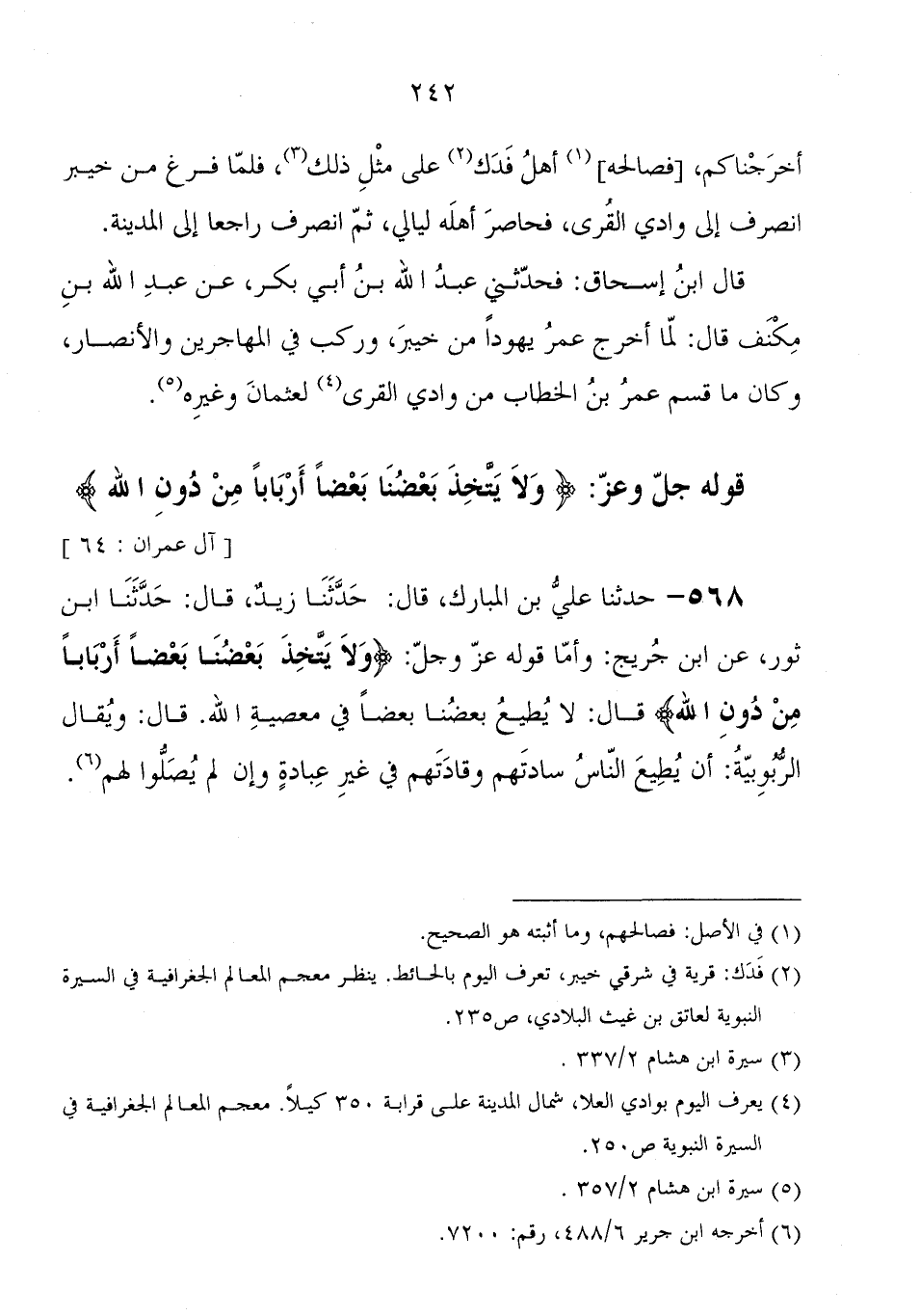 أخرجناكم فصالحه أَهْل فدك عَلَى مثل ذَلِكَ فَلَمَّا فرغ من خيبر انصرف إِلَى وادي القرى، فحاصر أهله ليالي، ثُمَّ انصرف راجعا إِلَى المدينة قَالَ ابْن إِسْحَاق: فحَدَّثَنِي عَبْد اللهِ بْن أبي بكر، عَنْ عَبْد اللهِ بْن مكنف، قَالَ: لما أخرج عمر يهودا من خيبر، وركب فِي المهاجرين، والأنصار، وَكَانَ مَا قسم عمر بْن الخطاب من وادي القرى لعثمان، وغيره