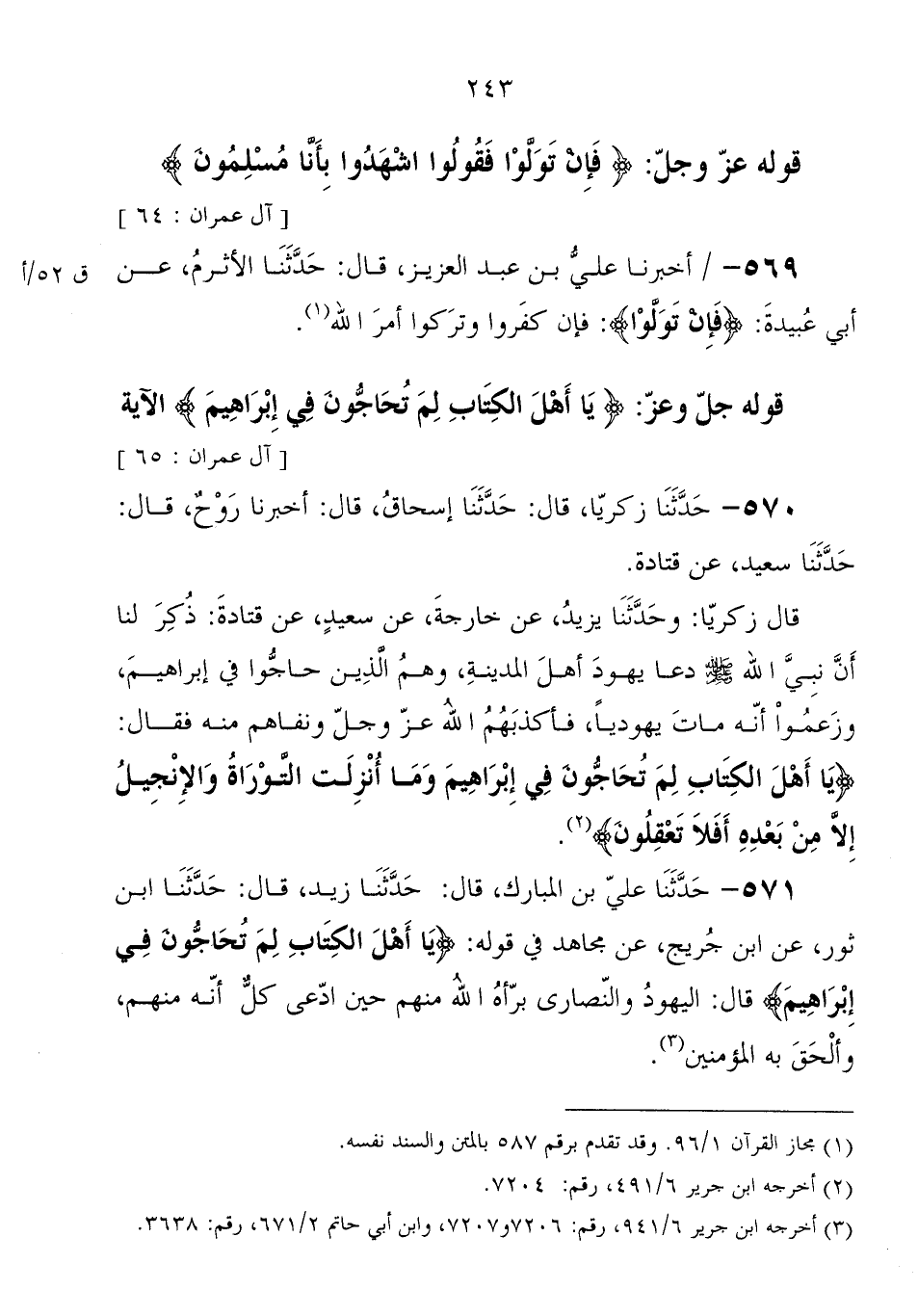 571 - حَدَّثَنَا علي بْن المبارك، قَالَ: حَدَّثَنَا زيد، قَالَ: حَدَّثَنَا ابْن ثور، عَنْ ابْن جريج، عَنْ مجاهد فِي قوله: {يَأَهْلَ الْكِتَابِ لِمَ تُحَاجُّونَ فِي إِبْرَاهِيمَ} قَالَ " اليهود والنصارى برأه الله منهم حين ادعى كُلّ أَنَّهُ منهم، وألحق بِهِ الْمُؤْمِنِينَ "