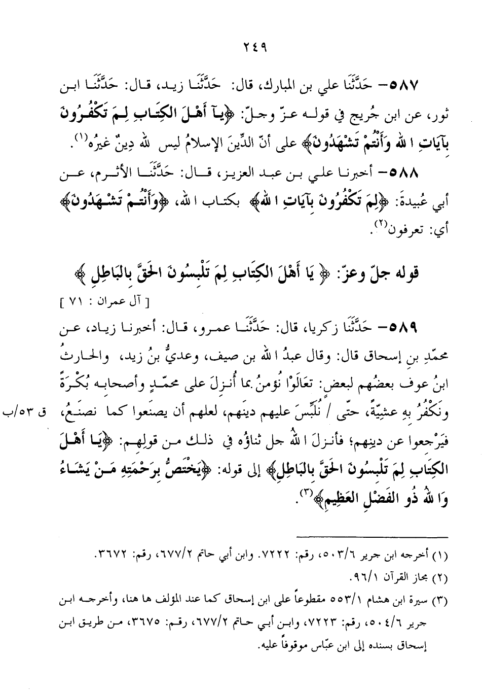 587 - حَدَّثَنَا علي بْن المبارك، قَالَ: حَدَّثَنَا زيد، قَالَ: حَدَّثَنَا ابْن ثور، عَنْ ابْن جريج، فِي قوله عَزَّ وَجَلَّ: {يَأَهْلَ الْكِتَابِ لِمَ تَكْفُرُونَ بِآيَاتِ اللهِ وَأَنْتُمْ تَشْهَدُونَ} " عَلَى أن الدين الإسلام لَيْسَ لله دين غيره "