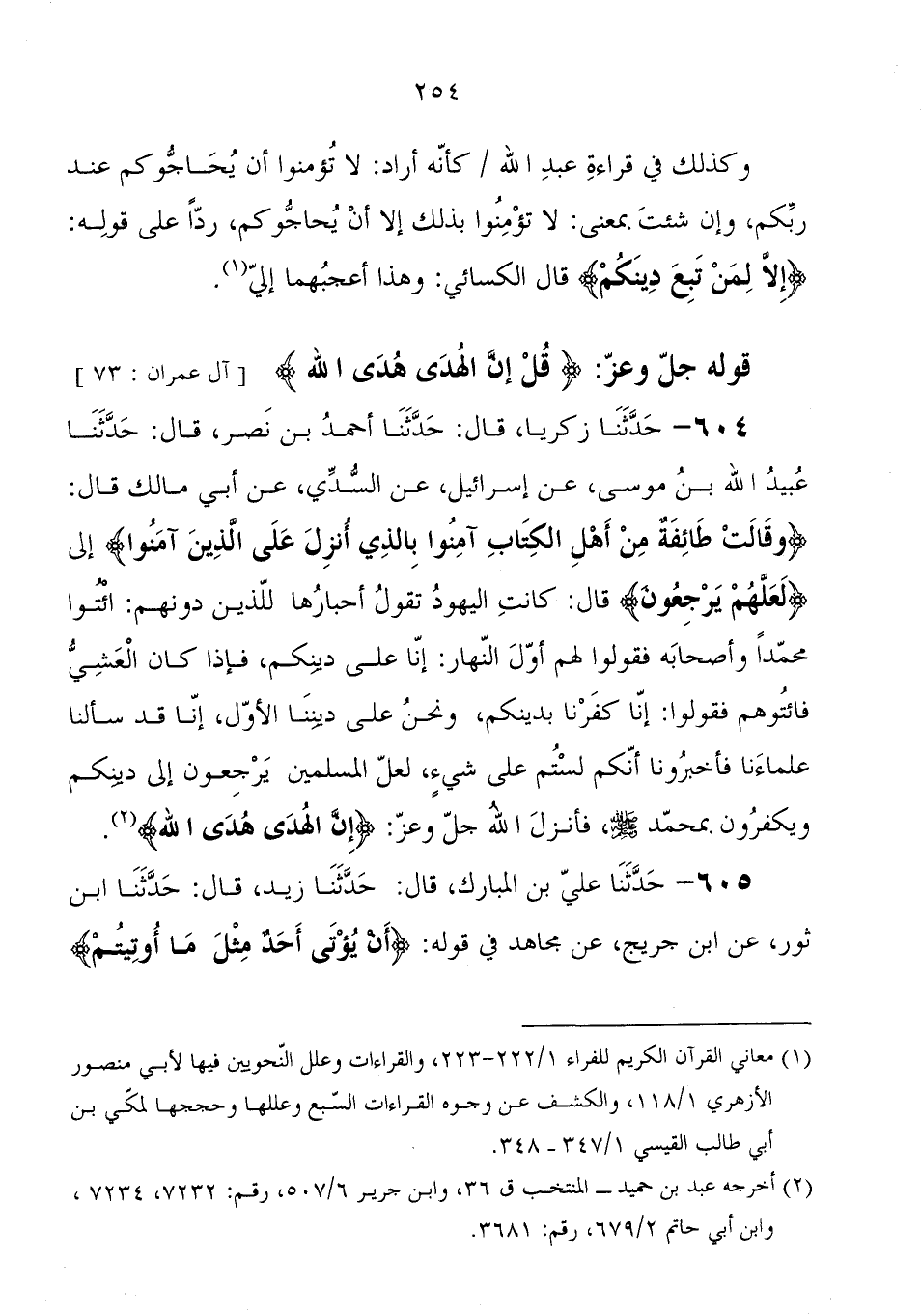 604 - حَدَّثَنَا زَكَرِيَّا، قَالَ: حَدَّثَنَا أحمد بْن نصر، قَالَ: حَدَّثَنَا عبيد الله بْن موسى، عَنْ إِسْرَائِيل، عَنْ السدي، عَنْ أبي مالك، قَالَ: {وَقَالَتْ طَائِفَةٌ مِنْ أَهْلِ الْكِتَابِ آمِنُوا بِالَّذِي أُنْزِلَ عَلَى الَّذِينَ آمَنُوا} قَالَ " كانت اليهود تقول أحبارها للذين دونهم: ائتوا محمدا وأصحابه، فقولوا لَهُمْ: أول النَّهَار إنا عَلَى دينكم، فَإِذَا كَانَ العشي فائتوهم، فقولوا: إنا كفرنا بدينكم، ونحن عَلَى ديننا الأول، إنا قَدْ سألنا علماءنا
