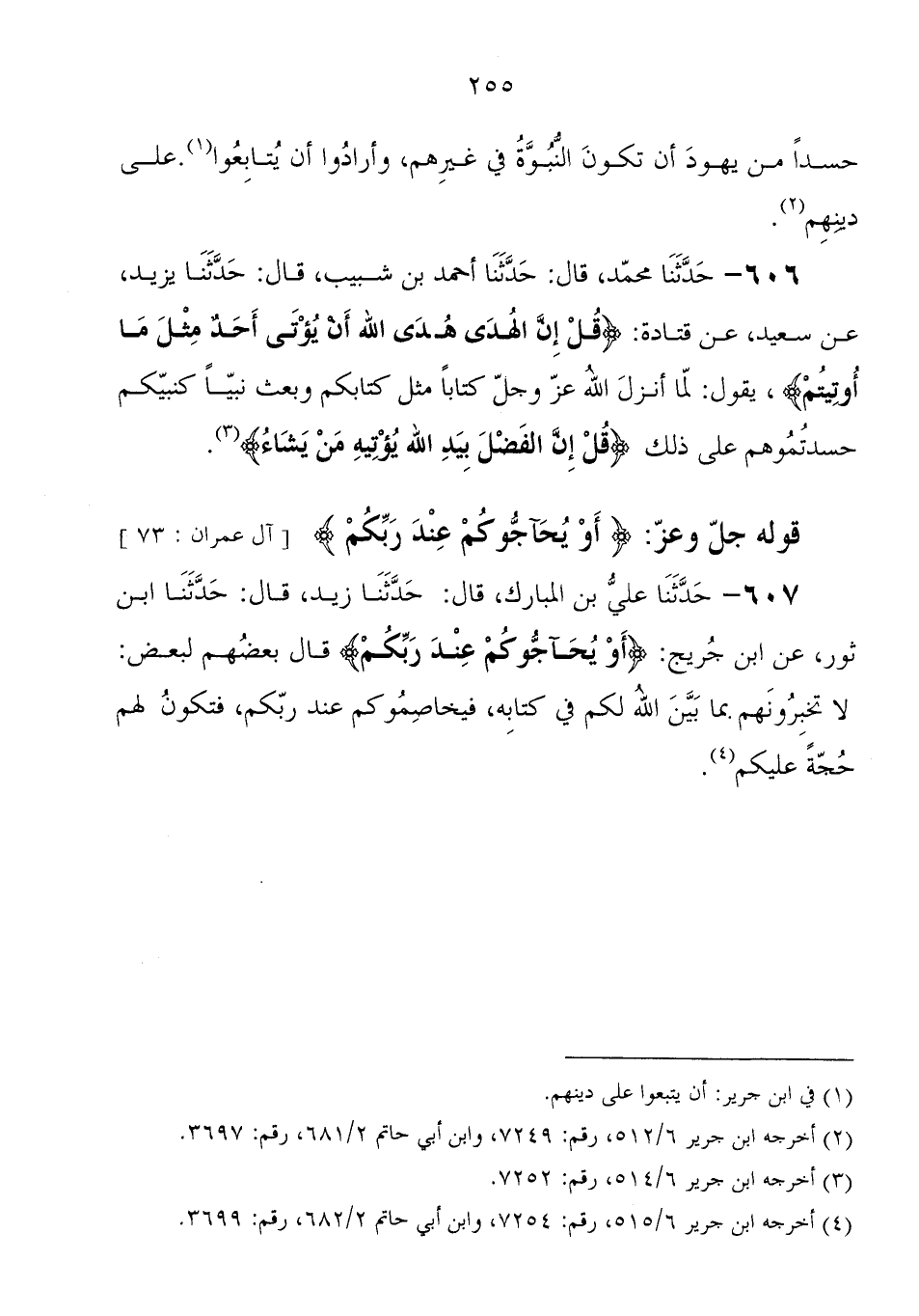 606 - حَدَّثَنَا محمد، قَالَ: حَدَّثَنَا أحمد بْن شبيب، قَالَ: حَدَّثَنَا يزيد، عَنْ سعيد، عَنْ قتادة: {قُلْ إِنَّ الْهُدَى هُدَى اللهِ أَنْ يُؤْتَى أَحَدٌ مِثْلَ مَا أُوتِيتُمْ} يقول: " لما أنزل الله عَزَّ وَجَلَّ كتابا مثل كتابكم، وبعث نبيا كنبيكم حسدتموهم عَلَى ذَلِكَ {قُلْ إِنَّ الْفَضْلَ بِيَدِ اللهِ يُؤْتِيهِ مَنْ يَشَاءُ} "