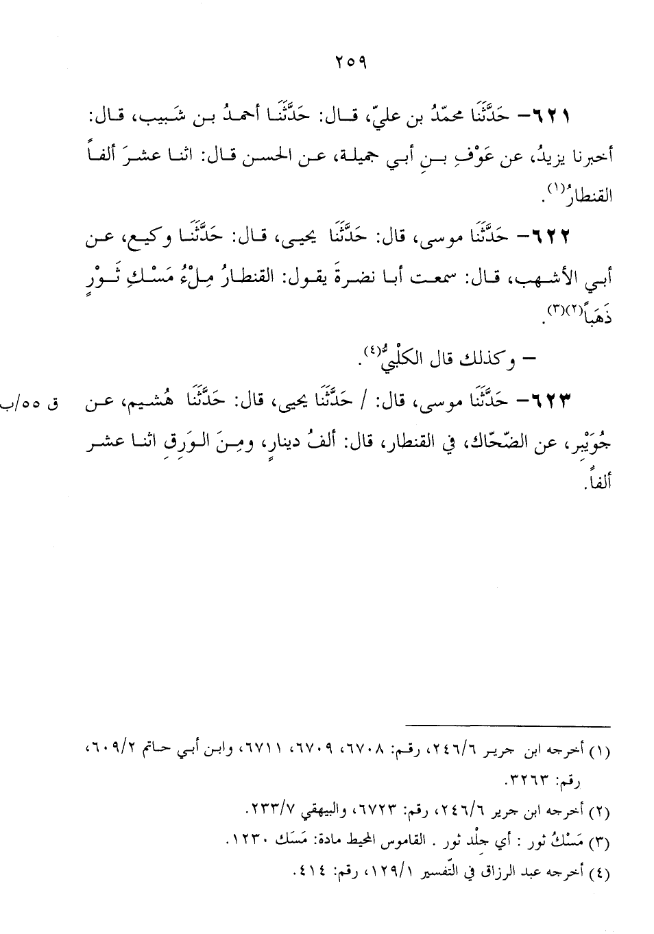 622 - " حَدَّثَنَا موسى، قَالَ: حَدَّثَنَا يَحْيَى، قَالَ: حَدَّثَنَا وكيع، عَنْ أبي الأشهب، قَالَ: سمعت أبا نضرة، يقول: " القنطار ملء مسك ثور ذهبا "، وكذلك قَالَ الكلبي