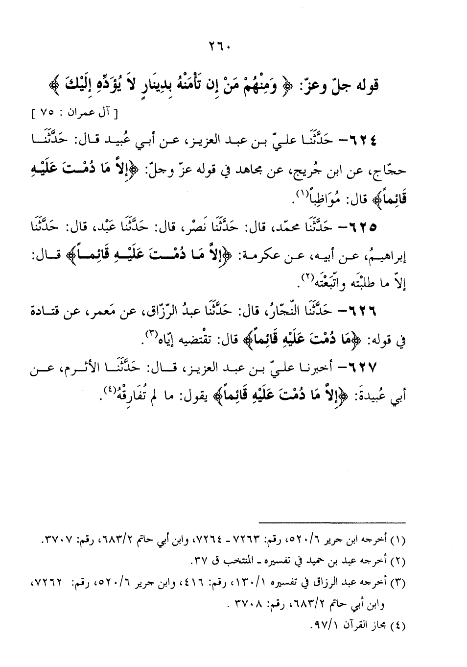 624 - حَدَّثَنَا علي بْن عَبْد العزيز، عَنْ أبي عبيد، قَالَ: حَدَّثَنَا حجاج، عَنْ ابْن جريج، عَنْ مجاهد، فِي قوله جَلَّ وَعَزَّ: {إِلا مَا دُمْتَ عَلَيْهِ قَائِمًا} قَالَ " مواظبا "