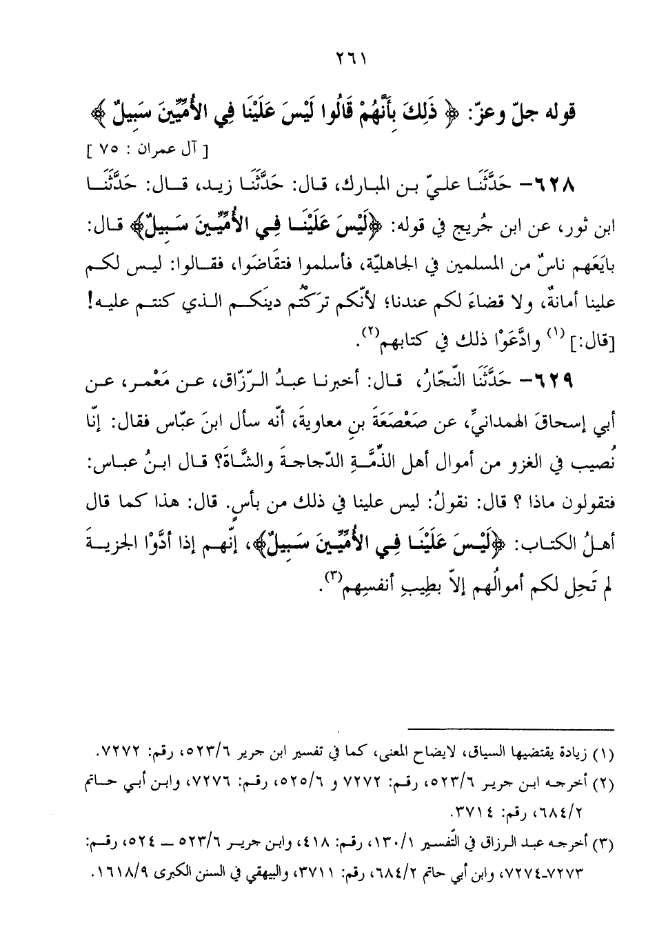 628 - حَدَّثَنَا علي بْن المبارك، قَالَ: حَدَّثَنَا زيد، قَالَ: حَدَّثَنَا ابْن ثور، عَنْ ابْن جريج، فِي قوله جَلَّ وَعَزَّ: {لَيْسَ عَلَيْنَا فِي الأُمِّيِّينَ سَبِيلٌ} قَالَ " بايعهم ناس من المسلمين فِي الجاهلية، فأسلموا فتقاضوا، فَقَالُوا: لَيْسَ لَكُمْ عَلَيْنَا أمانة وَلا قضاء لَكُمْ عندنا، لأنكم تركتم دينكم الَّذِي كنتم عَلَيْهِ، قَالَ: وادعو ذَلِكَ فِي كِتَابِِهِم "