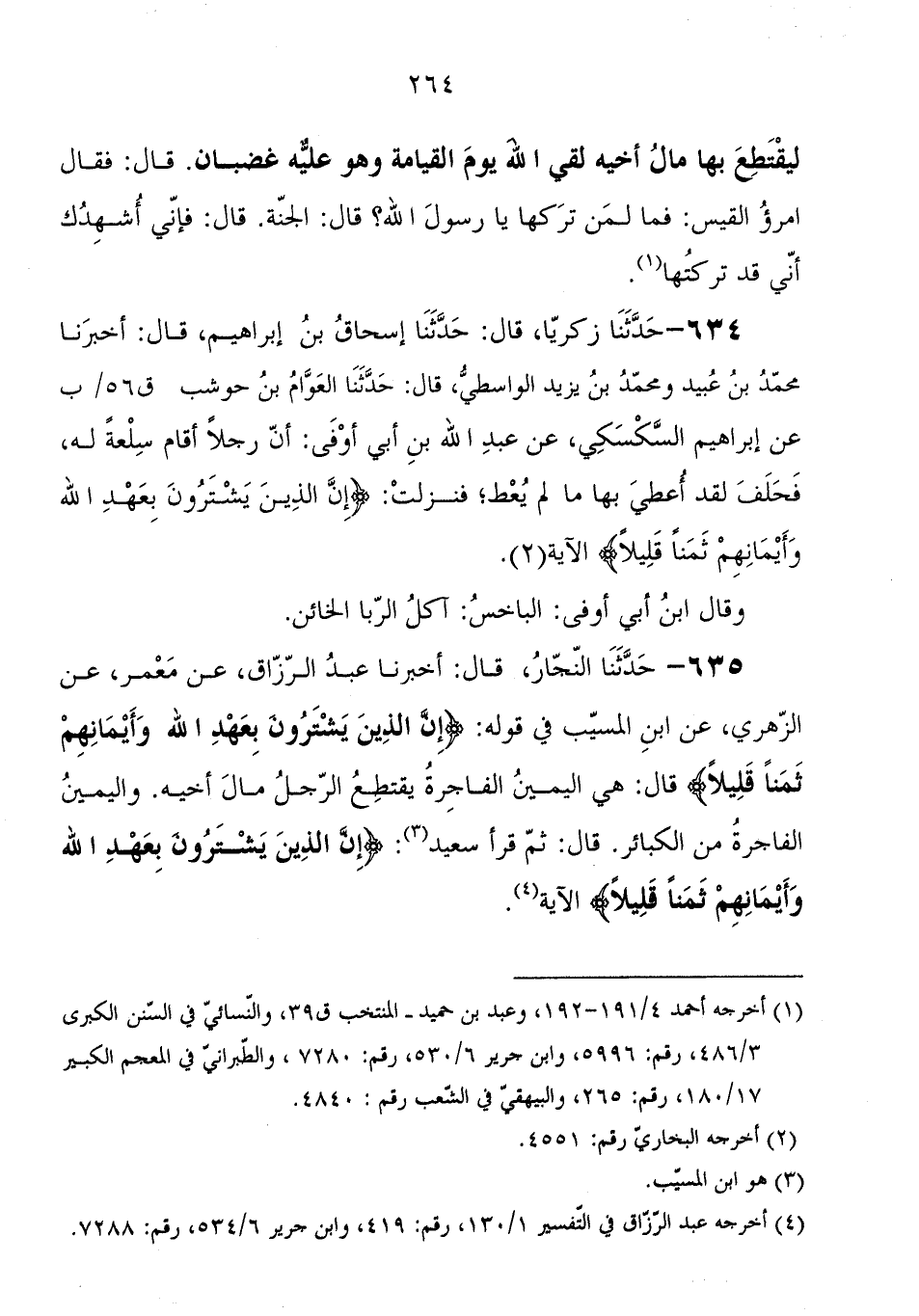 635 - حَدَّثَنَا النجار، قَالَ: أَخْبَرَنَا عَبْد الرزاق، عَنْ معمر، عَنْ الزهري، عَنْ ابْن المسيب، فِي قوله: {إِنَّ الَّذِينَ يَشْتَرُونَ بِعَهْدِ اللهِ وَأَيْمَانِهِمْ ثَمَنًا قَلِيلا} قَالَ: هي