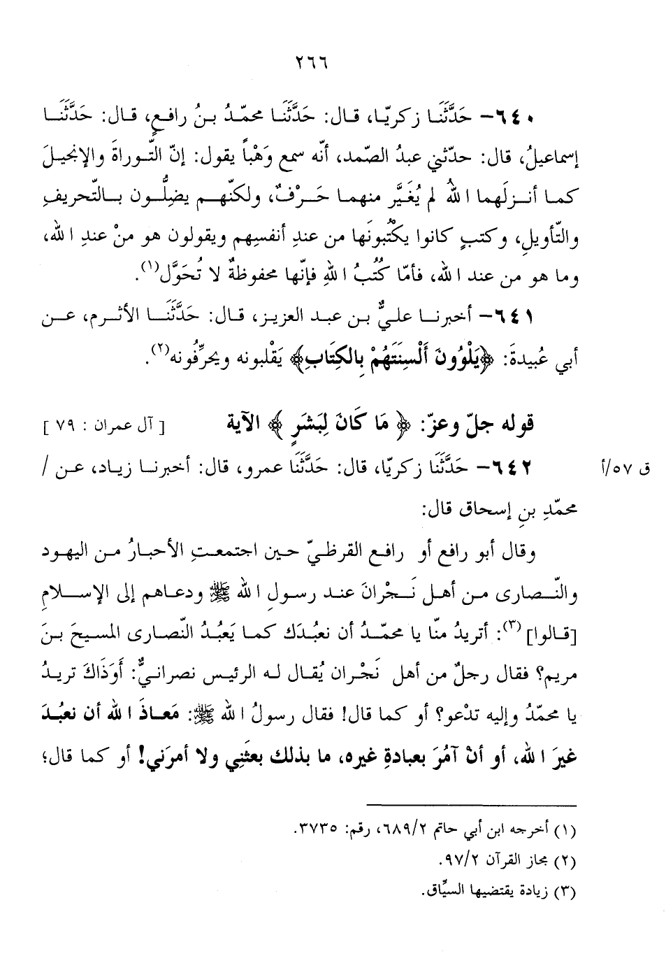 640 - حَدَّثَنَا زَكَرِيَّا، قَالَ: حَدَّثَنَا محمد بْن رافع، قَالَ: حَدَّثَنَا إسماعيل، قَالَ: حَدَّثَنِي عَبْد الصمد، أَنَّهُ سمع وهبا، يقول: " إن التوارة، والإنجيل كَمَا أنزلهما الله لم يغير منهما حرف، ولكنهم يضلون بالتحريف والتأويل، وكتب كانوا يكتبونها من عِنْد أنفسهم، ويقولون: هُوَ من عِنْد اللهِ، وَمَا هُوَ من عِنْد اللهِ، فَأَمَّا كتب الله فإنها محفوظة لا تحول "