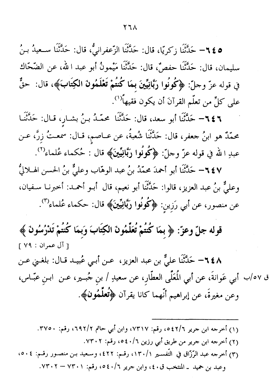 645 - حَدَّثَنَا زَكَرِيَّا، قَالَ: حَدَّثَنَا الزعفراني، قَالَ: حَدَّثَنَا سعيد بْن سليمان، قَالَ: حَدَّثَنَا حفص، قَالَ: حَدَّثَنَا ميمون أبو عَبْد اللهِ، عَنْ الضحاك، فِي قوله جَلَّ وَعَزَّ: {كُونُوا رَبَّانِيِّينَ بِمَا كُنْتُمْ تُعَلِّمُونَ الْكِتَابَ} قَالَ " حق عَلَى كُلّ من تعلم الْقُرْآن أن يكون فقيها "