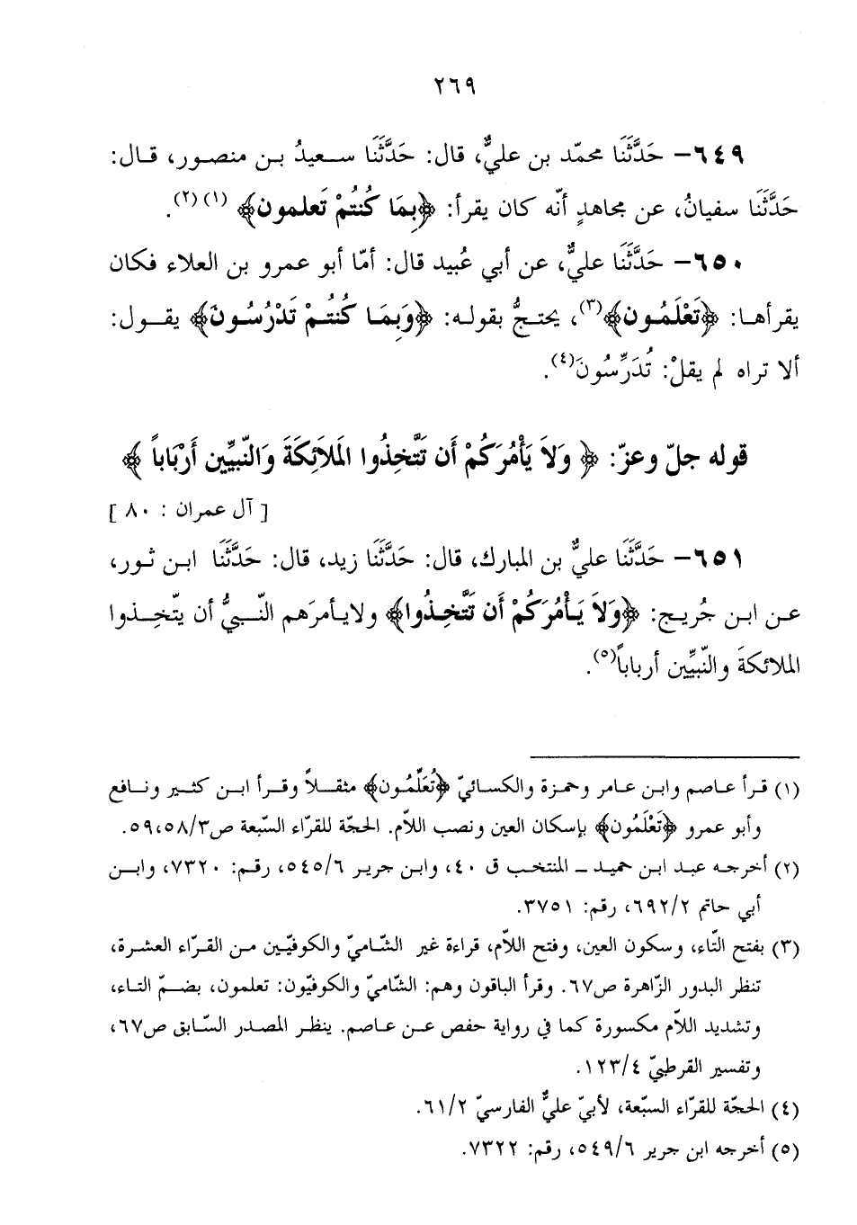 650 - حَدَّثَنَا علي، عَنْ أبي عبيد، قَالَ: أما أبو عمرو بْن العلاء، فَكَانَ يقرؤها: تعلمون يحتج بقوله: وَبِمَا كُنْتُمْ تَدْرُسُونَ يقول: " أَلا تراه لم يقل: " تدرسون