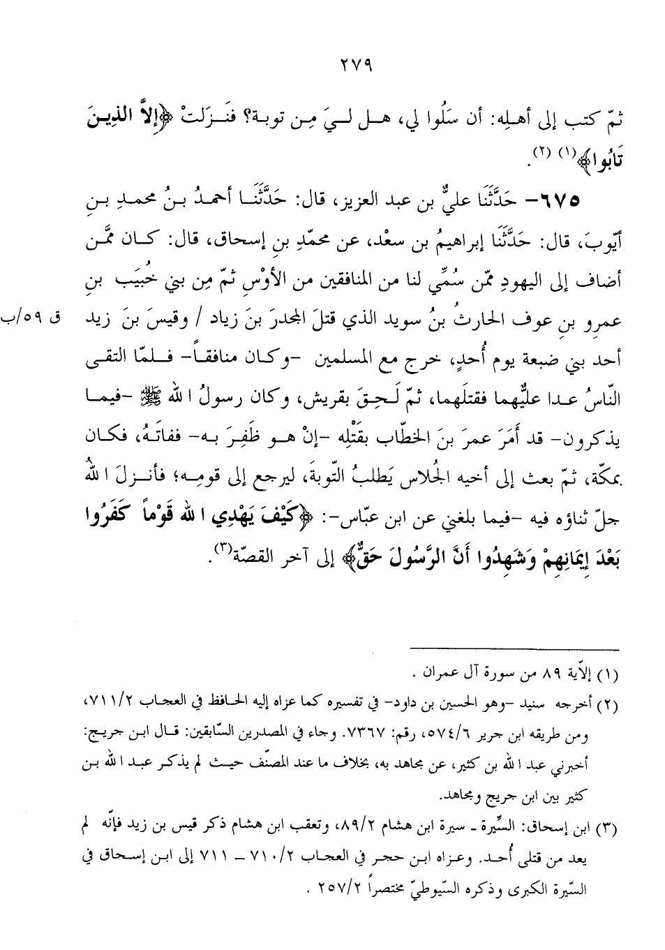 675 - حَدَّثَنَا عَلِيُّ بْنُ عَبْدِ الْعَزِيزِ، قَالَ: حَدَّثَنَا أَحْمَدُ بْنُ مُحَمَّدِ بْنِ أَيُّوبَ، قَالَ: حَدَّثَنَا إِبْرَاهِيمُ بْنُ سَعْدٍ، عَنْ مُحَمَّدِ بْنِ إِسْحَاقَ، قَالَ: " كَانَ مِمَّنْ أَضَافَ إِلَى الْيَهُودِ مِمَّنْ سُمِّيَ لَنَا مِنَ الْمُنَافِقِينَ مِنَ الأَوْسِ، ثُمَّ مِنْ بَنِي خَبِيبِ بْنِ عَمْرِو بْنِ عَوْفٍ الْحَارِثِ بْنِ سُوَيْدٍ الَّذِي قَتَلَ الْمُجَدَّرَ بْنَ زِيَادٍ، وَقَيْسَ بْنَ زَيْدٍ أَحَدَ بَنِي ضُبْعَةَ يَوْمَ أُحُدٍ، خَرَجَ مَعَ الْمُسْلِمِينَ، وَكَانَ مُنَافِقًا، فَلَمَّا الْتَقَى النَّاسُ عَدَا عَلَيْهِمَا فَقَتَلَهُمَا، ثُمَّ لَحِقَ بِقُرَيْشٍ، وَكَانَ رَسُولُ اللهِ صَلَّى اللَّهُ عَلَيْهِ وَسَلَّمَ فِيمَا يَذْكُرُونَ قَدْ أَمَرَ عُمَرَ بْنَ الْخَطَّابِ بِقَتْلِهِ إِنْ هُوَ ظَفِرَ بِهِ، فَفَاتَهُ، فَكَانَ بِمَكَّةَ، ثُمَّ بَعَثَ إِلَى أَخِيهِ الْجَلاسَ يَطْلُبُ التَّوْبَةَ لِيَرْجِعَ إِلَى قَوْمِهِ، فَأَنْزَلَ اللهُ جَلَّ ثَنَاؤُهُ فِيهِ، فِيمَا بَلَغَنِي عَنِ ابْنِ عَبَّاسٍ: {كَيْفَ يَهْدِي اللهُ قَوْمًا كَفَرُوا بَعْدَ إِيمَانِهِمْ وَشَهِدُوا أَنَّ الرَّسُولَ حَقٌّ} إِلَى آخِرِ الْقِصَّةِ "