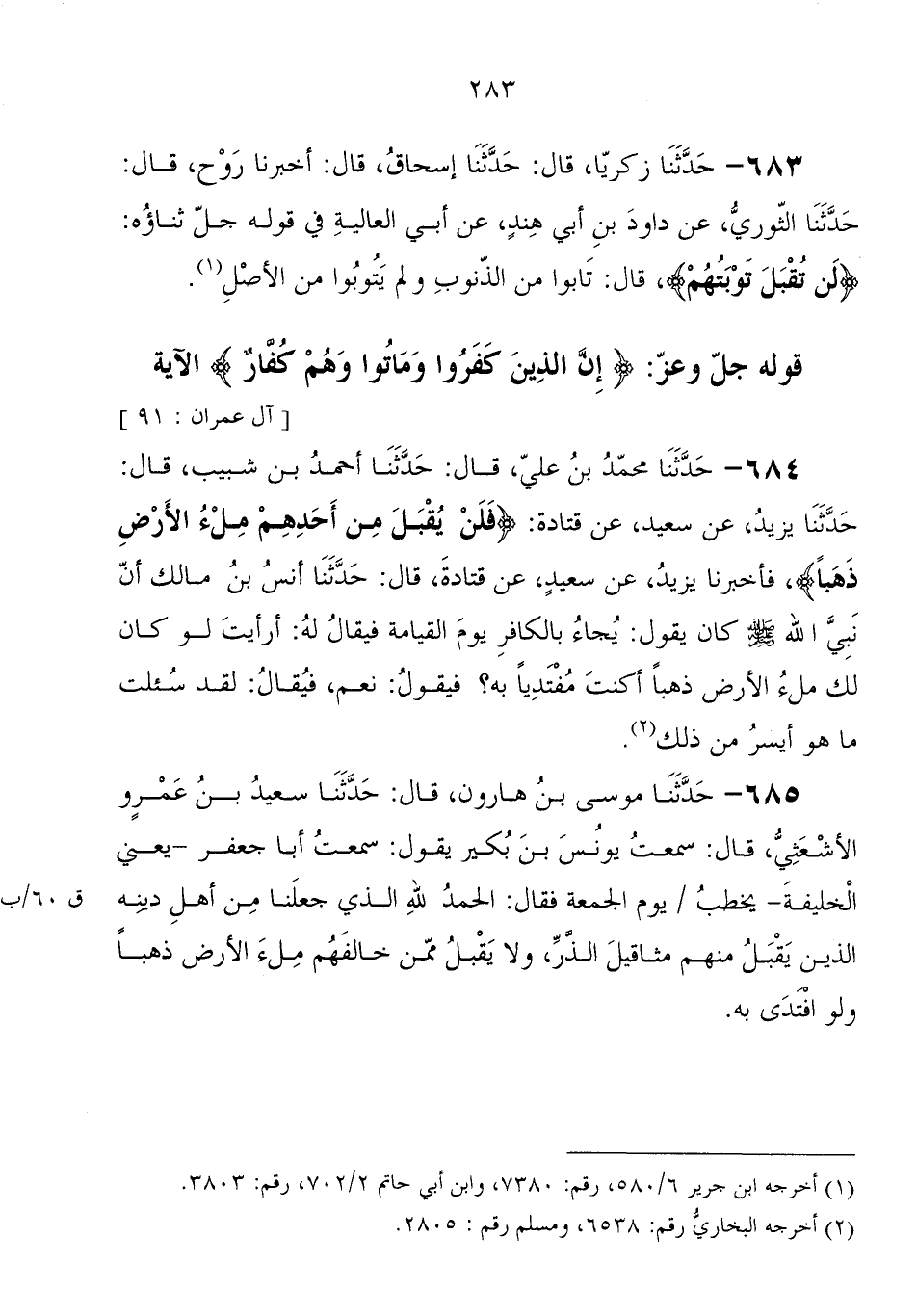 685 - حَدَّثَنَا موسى بْن هارون، قَالَ: حَدَّثَنَا سعيد بْن عمرو الأشعثي، قَالَ: سمعت يونس بْن بكير، يقول: سمعت أبا جعفر، يعني الخليفة يخطب يَوْم الجمعة، فَقَالَ " الحمد لله الَّذِي جعلنا مِنْ أَهْلِ دينه الذين يقبل منهم مثاقيل الذر، وَلا يقبل ممن خالفهم ملء الأرض ذهبا، ولو افتدى بِهِ "