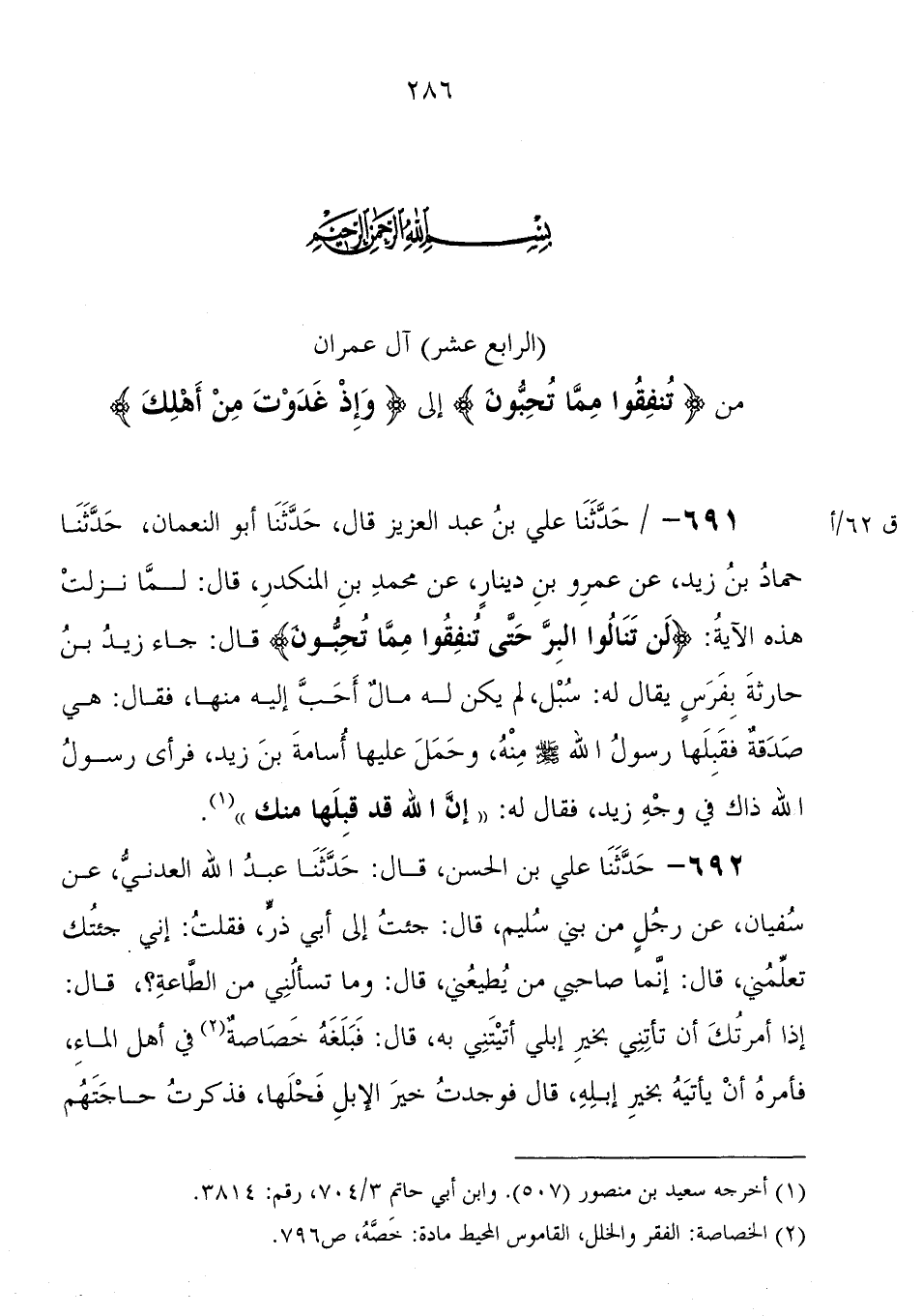 691 - حَدَّثَنَا عَلِيُّ بْنُ عَبْدِ الْعَزِيزِ، قَالَ: حَدَّثَنَا أَبُو النُّعْمَانِ، حَدَّثَنَا حَمَّادُ بْنُ زَيْدٍ، عَنْ عَمْرِو بْنِ دِينَارٍ، عَنْ مُحَمَّدِ بْنِ الْمُنْكَدِرِ، قَالَ: لَمَّا نَزَلَتْ هَذِهِ الآيَةُ: " {لَنْ تَنَالُوا الْبِرَّ حَتَّى تُنْفِقُوا مِمَّا تُحِبُّونَ} قَالَ: جَاءَ زَيْدُ بْنُ الْحَارِثِ بْنِ أَبِي أُسَامَةَ بِفَرَسٍ يُقَالُ لَهُ: سَبَلٌ لَمْ يَكُنْ لَهُ مَالٌ أَحَبَّ إِلَيْهِ مِنْهَا، فَقَالَ: هِيَ صَدَقَةٌ، فَقَبِلَهَا رَسُولُ اللهِ صَلَّى اللَّهُ عَلَيْهِ وَسَلَّمَ مِنْهُ، وَحَمَلَ عَلْيَهَا أُسَامَةَ بْنَ زَيْدٍ، فَرَأَى رَسُولُ اللهِ صَلَّى اللَّهُ عَلَيْهِ وَسَلَّمَ ذَاك فِي وَجْهِ زَيْدٍ، فَقَالَ لَهُ: " إِنَّ اللهَ قَدْ قَبِلَهَا مِنْكَ "