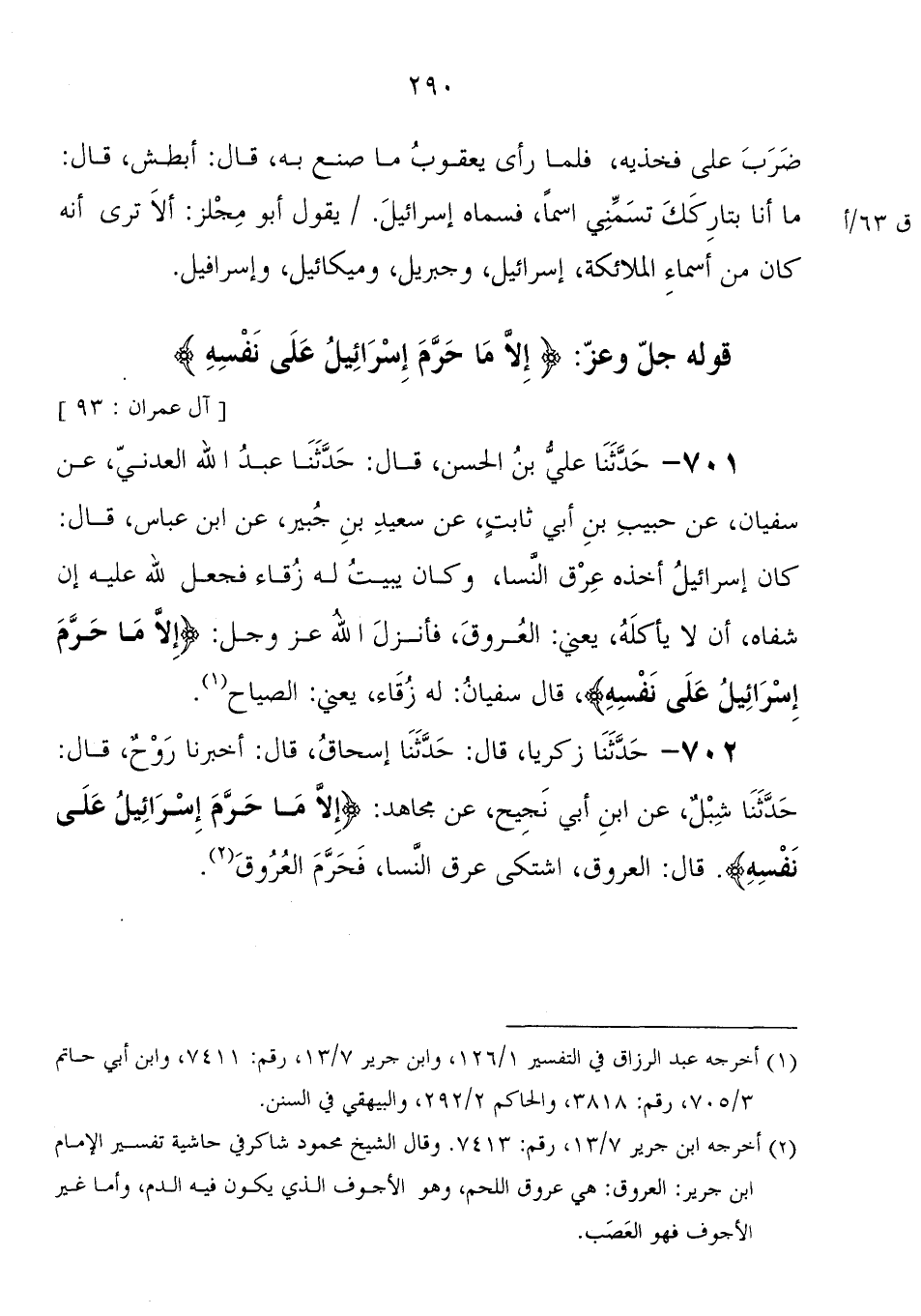 702 - حَدَّثَنَا زَكَرِيَّا، قَالَ: حَدَّثَنَا إِسْحَاق، قَالَ: أَخْبَرَنَا روح، قَالَ: حَدَّثَنَا شبل، عَنْ ابْن أبي نجيح، عَنْ مجاهد: {إِلا مَا حَرَّمَ إِسْرَائِيلُ عَلَى نَفْسِهِ} قَالَ " العروق اشتكى عرق النسا فحرم العروق "