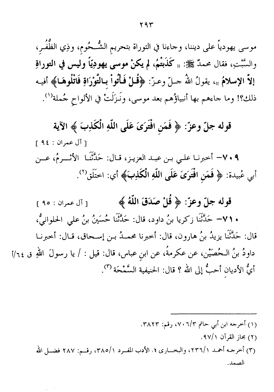 709 - أَخْبَرَنَا علي بْن عَبْد العزيز، قَالَ: حَدَّثَنَا الأثرم، عَنْ أبي عبيدة: {فَمَنِ افْتَرَى عَلَى اللهِ الْكَذِبَ} أي: " اختلق