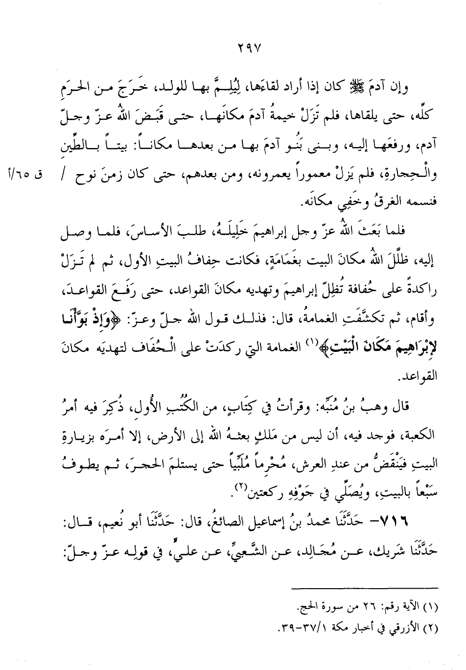 وإن آدم صَلَّى اللَّهُ عَلَيْهِ وَسَلَّمَ إذا أراد لقاءها ليلم بِهَا للولد خَرَجَ من الحرم كله حَتَّى يلقاها، فلم تزل خيمة آدم مكانها حَتَّى قبض الله عَزَّ وَجَلَّ آدم، ورفعها إِلَيْهِ، وبنى بنو آدم بِهَا من بعدها مكانا: بيتا بالطين والحجارة، فلم يزل معمورا يعمرونه، ومن بعدهم حَتَّى كَانَ زمن نوح، فنسمه الغرق وخفي مكانه فَلَمَّا بعث الله عَزَّ وَجَلَّ إِبْرَاهِيم خليله، طلب الأساس، فَلَمَّا وصل إِلَيْهِ ظلل الله مكان الْبَيْت بغمامة، فكانت حفاف الْبَيْت الأول، ثُمَّ لم تزل راكدة عَلَى حفافة تظل إِبْرَاهِيم وتهديه مكان القواعد، حَتَّى رفع القواعد وأقام، ثُمَّ تكشف الغمامة، قَالَ: فذلك قول الله جَلَّ وَعَزَّ: {وَإِذْ بَوَّأْنَا لإِبْرَاهِيمَ مَكَانَ الْبَيْتِ} الغمامة الَّتِي ركدت على الحفاف لتهديه مكان القواعد " قَالَ وهب بْن منبه: وقرأت فِي كِتَابِ من الكتب الأول، ذكر