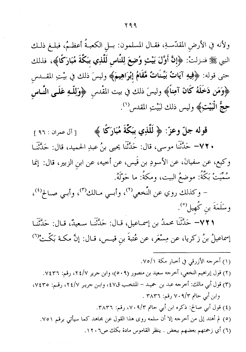 720 - حَدَّثَنَا موسى، قَالَ: حَدَّثَنَا يَحْيَى بْن عَبْد الحميد، قَالَ: حَدَّثَنَا وكيع، عَنْ سفيان، عَنْ الأسود بْن قيس، عَنْ أخيه، عَنْ ابْن الزبير، قَالَ " إِنَّمَا سميت بكة موضع الْبَيْت، ومكة مَا حوله "، وكذلك روي عَنِ النخعي، وأبي مالك، وأبي صالح، وسلمة بْن كهيل