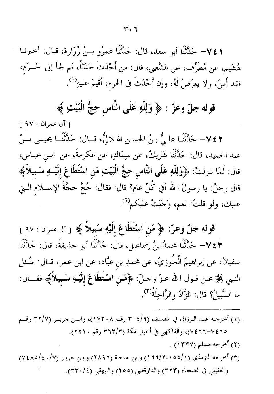 743 - حَدَّثَنَا محمد بْن إسماعيل، قَالَ: حَدَّثَنَا أبو حذيفة، قَالَ: حَدَّثَنَا سفيان، عَنْ إِبْرَاهِيم الخوزي، عن محمد بن عباد، عن ابن عمر، قال سئل النبي صَلَّى اللَّهُ عَلَيْهِ وَسَلَّمَ، عَنْ قول الله عَزَّ وَجَلَّ: {مَنِ اسْتَطَاعَ إِلَيْهِ سَبِيلا} فَقَالَ " مَا السبيل؟ قَالَ: الزاد، والراحلة "