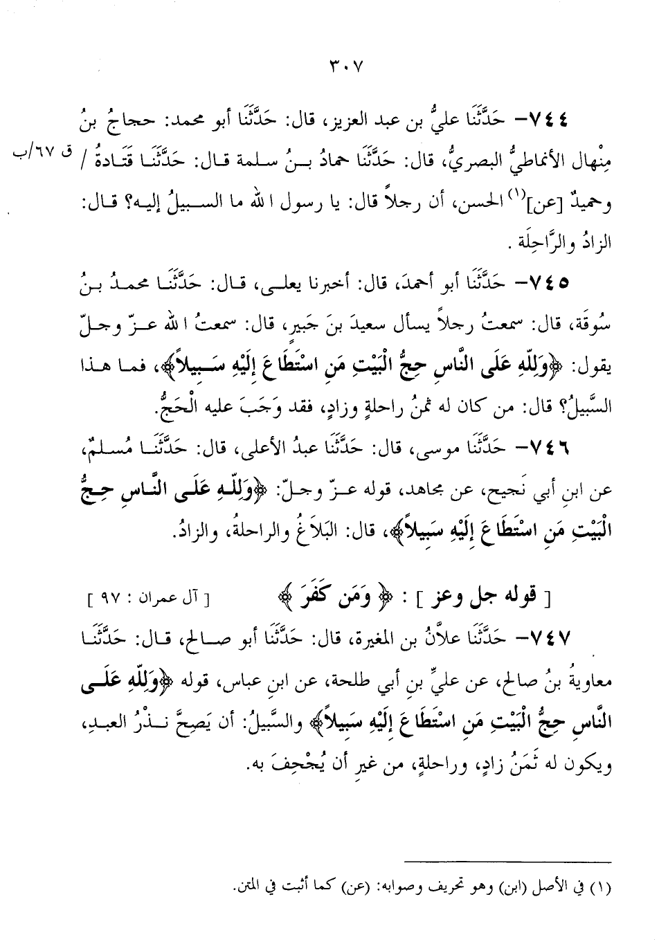 747 - حَدَّثَنَا عَلانُ بْنُ الْمُغِيرَةِ، قَالَ: حَدَّثَنَا أَبُو صَالِحٍ، قَالَ: حَدَّثَنِي مُعَاوِيَةُ بْنُ صَالِحٍ، عَنْ عَلِيِّ بْنِ أَبِي طَلْحَةَ، عَنِ ابْنِ عَبَّاسٍ، قوله: " {وَلِلَّهِ عَلَى النَّاسِ حِجُّ الْبَيْتِ مَنِ اسْتَطَاعَ إِلَيْهِ سَبِيلا} وَالسَّبِيلُ: أَنْ يَصِحَّ نَذْرُ الْعَبْد، وَيَكُونَ لَهُ ثَمَنُ زَادٍ، وَرَاحِلَةٌ، مِنْ غَيْرِ أَنْ يُجْحِفَ بِهِ "