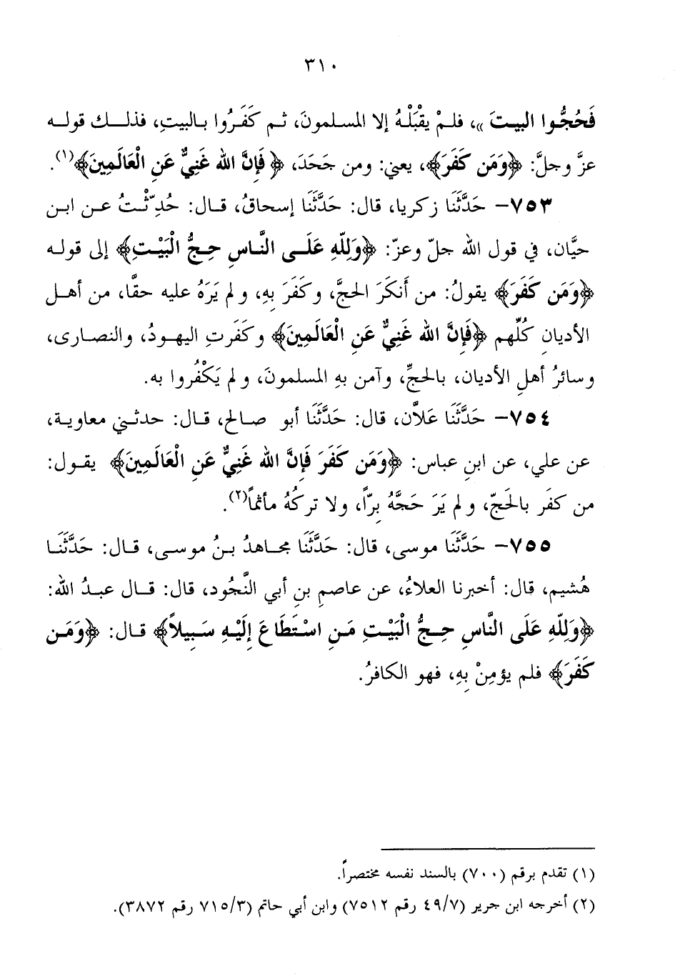 753 - حَدَّثَنَا زَكَرِيَّا، قَالَ: حَدَّثَنَا إِسْحَاق، قَالَ: حدثت عَنْ ابْن حيان، فِي قول الله جَلَّ وَعَزَّ: {وَلِلَّهِ عَلَى النَّاسِ حِجُّ الْبَيْتِ إِلَى قوله: وَمَنْ كَفَرَ} يقول: " من أنكر الحج، وكفر بِهِ، ولم يره عَلَيْهِ حقا، مِنْ أَهْلِ الأديان كلهم {فَإِنَّ اللهَ غَنِيٌّ عَنِ الْعَالَمِينَ} وكفرت اليهود، والنصارى، وسائر أَهْل الأديان بالحج، وآمن بِهِ المسلمون، ولم يكفروا بِهِ "