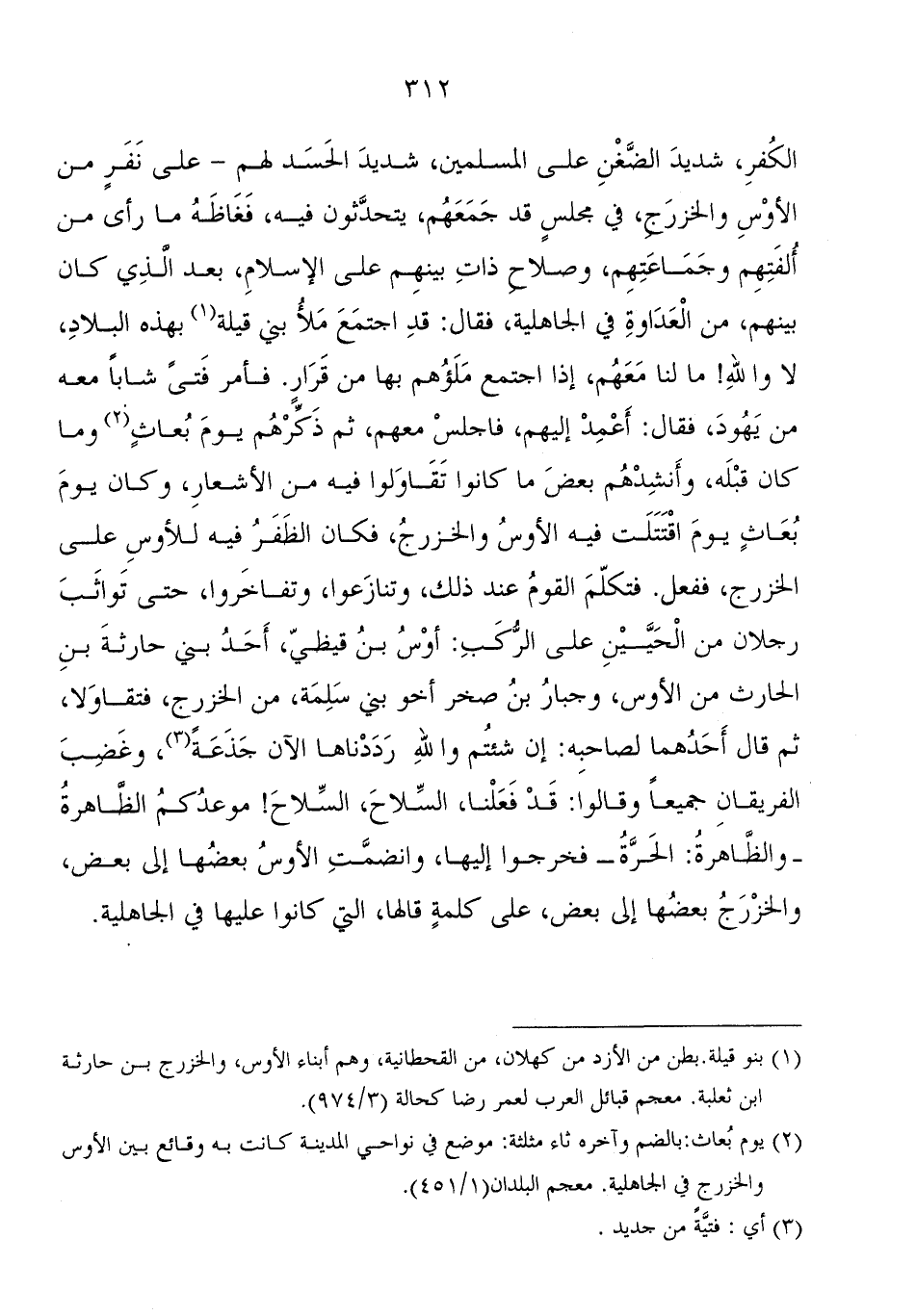 الْكُفْرِ شَدِيدَ الضِّغْنِ عَلَى الْمُسْلِمِينَ شَدِيدَ الْحَسَدِ لَهُمْ، عَلَى نَفِيرٍ مِنَ الأَوْسِ وَالْخَزْرَجِ فِي مَجْلِسٍ قَدْ جَمَعَهُمْ يَتَحَدَّثُونَ فِِيهِِ، فَغَاظَهُ مَا رَأَى مِنْ أُلْفَتِهِمْ، وَجَمَاعَتِهِمْ، وَصَلاحِ ذَاتِ بَيْنِهِمْ عَلَى الإِسْلامِ بَعْدَ الَّذِي كَانَ بَيْنَهْمُ مِنَ الْعَدَاوَةِ فِي الْجَاهِلِيَّةِ، فَقَالَ: قَدِ اجْتَمَعَ مَلأُ بَنِي قَيْلَةَ بِهَذِهِ الْبِلادِ، لا وَاللهِ مَا لَنَا مَعَهُمْ إِذَا اجْتَمَعَ مَلَؤُهُمْ بِهَا مِنْ قَرَارٍ، فَأَمَرَ فَتًى شَابًّا مَعَهُ مِنْ يَهُودَ، فَقَالَ: اعْمِدْ إِلَيْهِمْ فَاجْلِسْ مَعَهُمْ، ثُمَّ ذَكِّرْهُمْ يَوْمَ بُعَاثٍ، وَمَا كَانَ قَبْلَهُ، وَأَنْشَدَهُمْ بَعْضَ مَا كَانُوا تَقَاوَلُوا فِيهِ مِنَ الأَشْعَارِ، وَكَانَ يَوْمَ بُعَاثٍ يَوْمَ اقْتَتَلَتْ فِيهِ الأَوْسُ وَالْخَزْرَجُ، فَكَانَ الظَّفَرُ فِيهِ لِلأَوْسِ عَلَى الْخَزْرَجِ، فَفَعَلَ فَتَكَلَّمَ الْقَوْمُ عِنْدَ ذَلِكَ، وَتَنَازَعُوا، وَتَفَاخَرُوا حَتَّى تَوَاثَبَ رَجُلانِ مِنَ الْحَيَّيْنِ عَلَى الرَّكْبِ: أَوْسُ بْنُ قَيْظِيٍّ، أَحَدُ بْنُ الْحَارِثِ بْنِ أَبِي أُسَامَةَ بْنِ الْحَارِثِ مِنَ الأَوْسِ، وَجَبَّارُ بْنُ صَخْرٍ أَخُو بْنِي سَلَمَةَ مِنَ الْخَزْرَجِ، فَتَقَاوَلا، ثُمَّ قَالَ أَحَدُهُمَا لِصَاحِبِهِ: إِنْ شِئْتْمُ وَاللهِ رَدَدْنَاهَا الآنَ جَذِعَةً وَغَضِبَ الْفَرِيقَانِ جَمِيعًا، وَقَالُوا: قَدْ فَعَلْنَا السِّلاحَ، السِّلاحَ مَوْعِدُكُمُ الظَّاهِرَةُ، وَالظَّاهِرَةُ الْحَرَّةُ، فَخَرَجُوا إِلَيْهَا، وَانْضَمَّتِ الأَوْسُ بَعْضُهَا إِلَى بَعْضٍ، وَالْخَزْرَجُ بَعْضُهَا إِلَى بَعْضٍ عَلَى كَلِمَةٍ، قَالَهَا الَّتِي كَانُوا عَلَيْهَا فِي الْجَاهِلِيَّةِ،