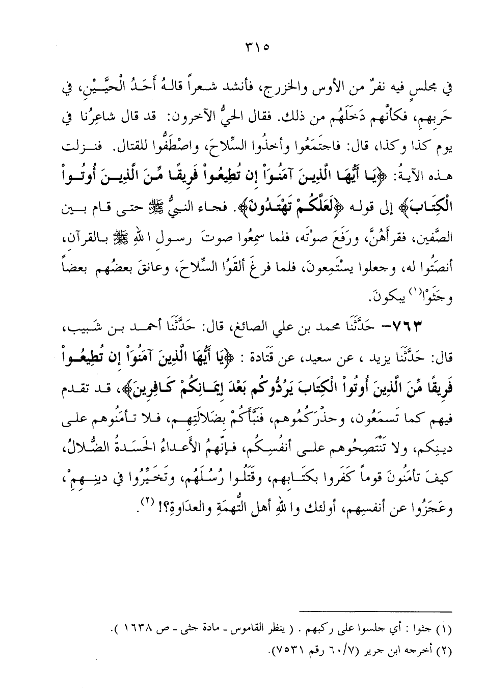 763 - حَدَّثَنَا محمد بْن علي الصائغ، قَالَ: حَدَّثَنَا أحمد بْن شبيب، قَالَ: حَدَّثَنَا يزيد، عَنْ سعيد، عَنْ قتادة: {يَأَيُّهَا الَّذِينَ آمَنُوا إِنْ تُطِيعُوا فَرِيقًا مِنَ الَّذِينَ أُوتُوا الْكِتَابَ يَرُدُّوكُمْ بَعْدَ إِيمَانِكُمْ كَافِرِينَ} " قَدْ تقدم فيهم كَمَا تسمعون وحذركموهم، فنبأكم بضلالتهم، فلا تأمنوهم عَلَى دينكم، وَلا تنتصحوهم عَلَى أنفسكم،