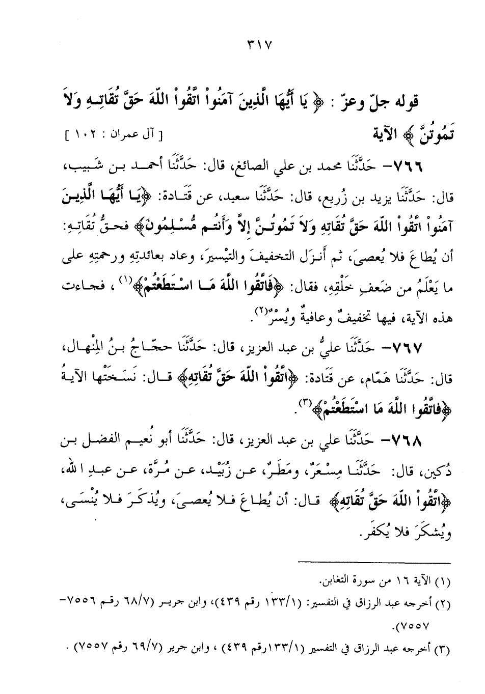 767 - حَدَّثَنَا علي بْن عَبْد العزيز، قَالَ: حَدَّثَنَا حجاج بْن المنهال، قَالَ: حَدَّثَنَا همام، عَنْ قتادة: {اتَّقُوا اللهَ حَقَّ تُقَاتِهِ} قَالَ " نسختها الآيَة {فَاتَّقُوا اللهَ مَا اسْتَطَعْتُمْ} "