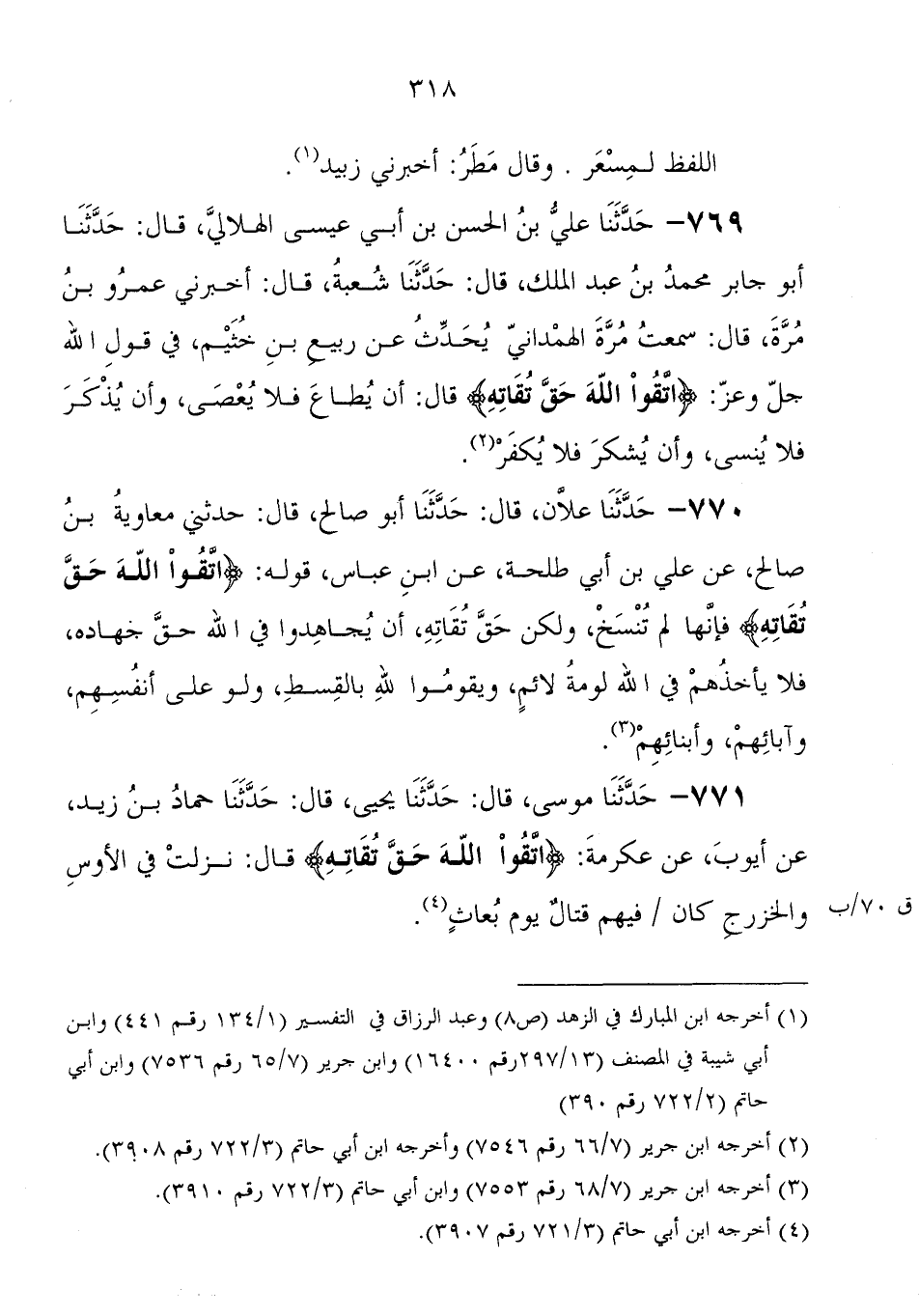 عَنْ ربيع بْن خثيم، فِي قول الله جَلَّ وَعَزَّ: {اتَّقُوا اللهَ حَقَّ تُقَاتِهِ} قَالَ " أن يطع فلا يعصى، وأن يذكر فلا ينسى، وأن يشكر فلا يكفر "