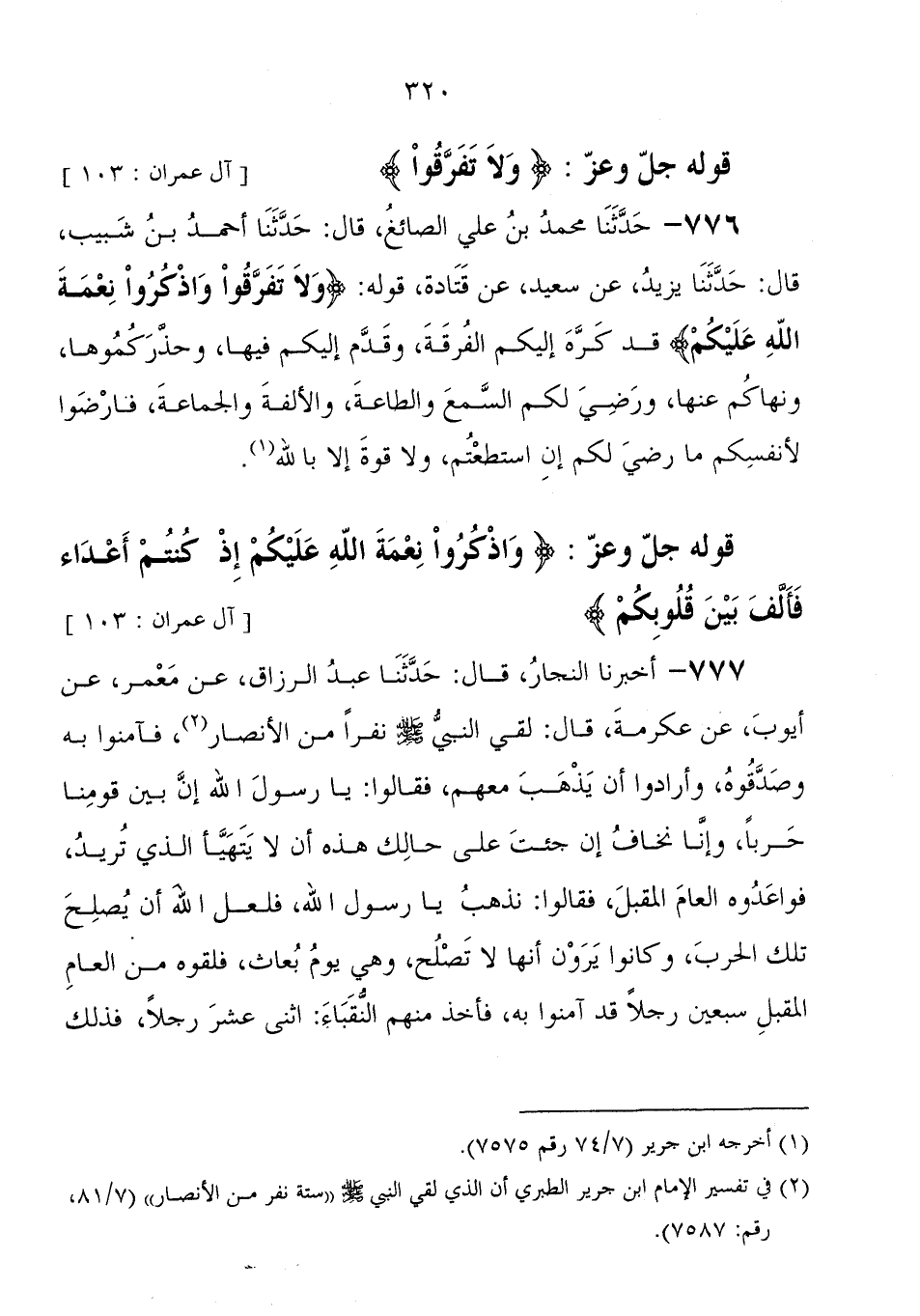 776 - حَدَّثَنَا محمد بْن علي الصائغ، قَالَ: حَدَّثَنَا أحمد بْن شبيب، قَالَ: حَدَّثَنَا يزيد، عَنْ سعيد، عَنْ قتادة، قوله: {وَلا تَفَرَّقُوا وَاذْكُرُوا نِعْمَتَ اللهِ عَلَيْكُمْ} " قَدْ كره إليكم الفرقة، وقدم إليكم فِيهَا، وحذركموها، ونهاكم عنها، ورضي لَكُمُ السمع، والطاعة، والألفة، والجماعة، فارضوا لأنفسكم مَا رضي لَكُمْ إن استطعتم وَلا قوة إِلا بالله