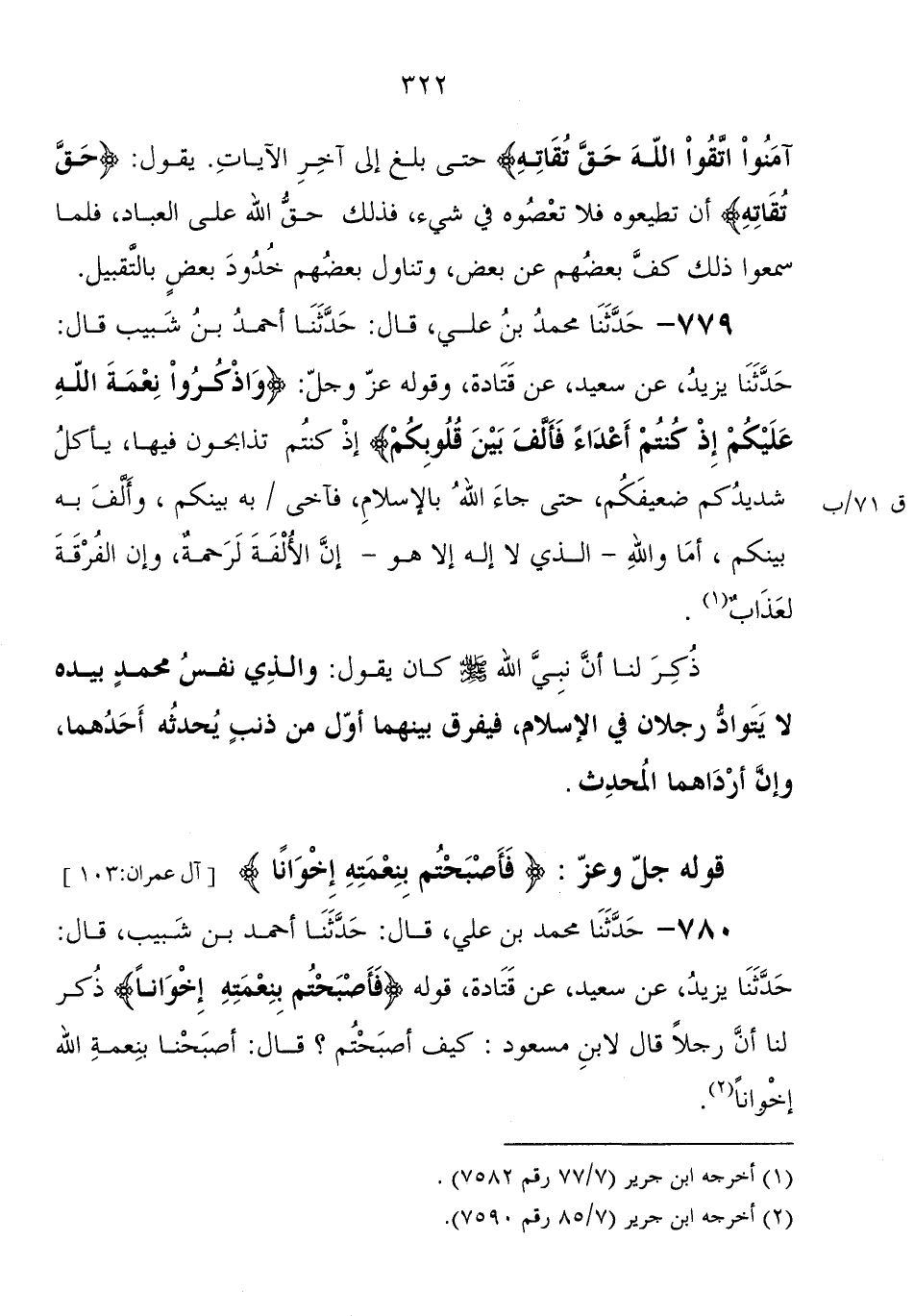 780 - حَدَّثَنَا مُحَمَّدُ بْنُ عَلِيٍّ، قَالَ: حَدَّثَنَا أَحْمَدُ بْنُ شَبِيبٍ، قَالَ: حَدَّثَنَا يَزِيدُ، عَنْ سَعِيدٍ، عَنْ قَتَادَةَ، قوله: " {فَأَصْبَحْتُمْ بِنِعْمَتِهِ إِخْوَانًا} ذُكِرَ لَنَا أَنَّ رَجُلا قَالَ لابْنِ مَسْعُودٍ: كَيْفَ أَصْبَحْتُمْ؟ قَالَ: أَصْبَحْنَا بِنِعْمَةِ اللهِ إِخْوَانًا "