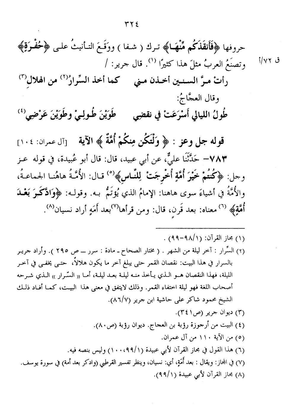 783 - حَدَّثَنَا علي، عَنْ أبي عبيد، قَالَ: قَالَ أبو عبيدة، فِي قوله عَزَّ وَجَلَّ: {كُنْتُمْ خَيْرَ أُمَّةٍ أُخْرِجَتْ لِلنَّاسِ} قَالَ " الأمة هاهنا الجماعة، والأمة فِي أشياء سوى هاهنا: الإمام الَّذِي يؤتم بِهِ " وقوله {وَادَّكَرَ بَعْدَ أُمَّةٍ} معناه: " بعد قرن " قَالَ: " ومن قرأها بعد أمة أراد نسيان "