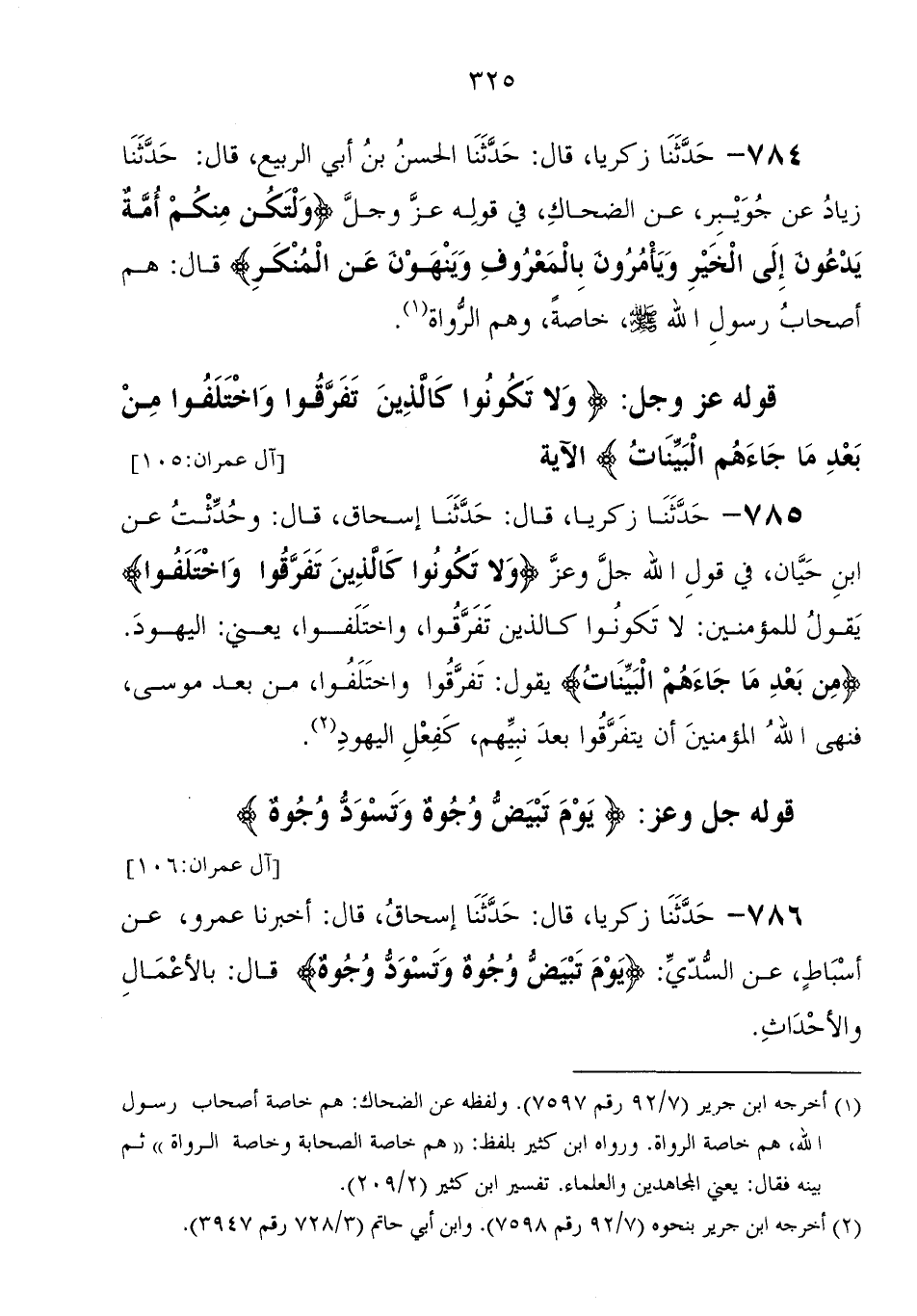 785 - حَدَّثَنَا زَكَرِيَّا، قَالَ: حَدَّثَنَا إِسْحَاق، قَالَ: وحدثت عَنْ ابْن حيان، فِي قوله جَلَّ وَعَزَّ: {وَلا تَكُونُوا كَالَّذِينَ تَفَرَّقُوا وَاخْتَلَفُوا} " يقول للمؤمنين: لا تكونوا كالذين تفرقوا واختلفوا يعني اليهود " {مِنْ بَعْدِ مَا جَاءَهُمُ الْبَيِّنَاتُ} يقول: " تفرقوا واختلفوا من بعد موسى، فنهى الله الْمُؤْمِنِينَ أن يتفرقوا بعد نبيهم كفعل اليهود