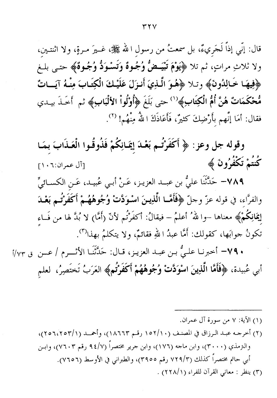 790 - أَخْبَرَنَا علي بْن عَبْد العزيز، قَالَ: حَدَّثَنَا الأثرم، عَنْ أبي عبيدة: {فَأَمَّا الَّذِينَ اسْوَدَّتْ وُجُوهُهُمْ أَكَفَرْتُمْ} " العرب تختصر لعلم