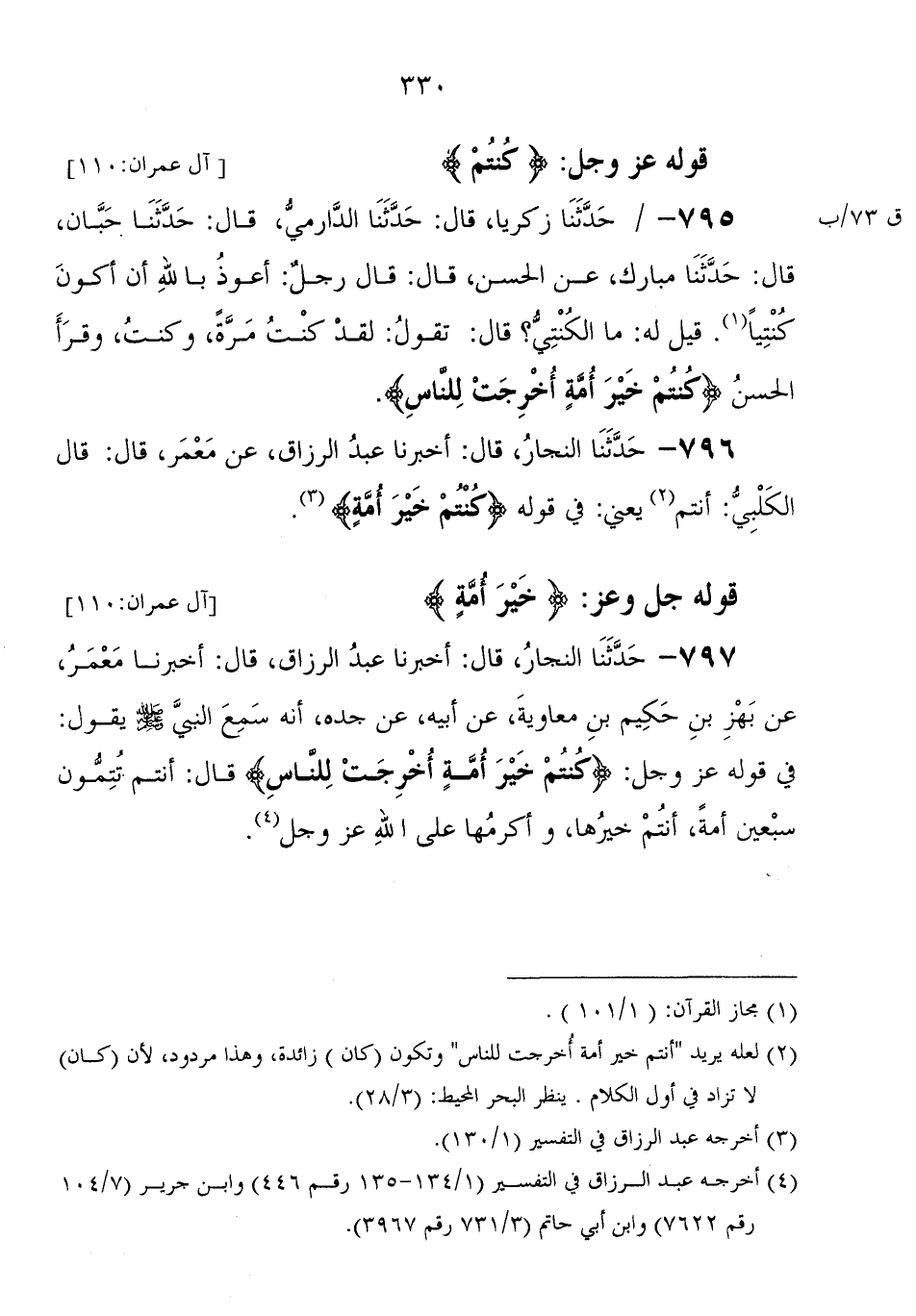 796 - حَدَّثَنَا النجار، قَالَ: أَخْبَرَنَا عَبْد الرزاق، عَنْ معمر، قَالَ: قَالَ الكلبي " أنتم، يعني فِي قوله: {كُنْتُمْ خَيْرَ أُمَّةٍ}
