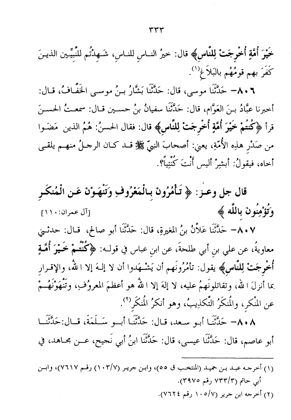 807 - حَدَّثَنَا عَلانُ بْنُ الْمُغِيرَةِ، قَالَ: حَدَّثَنَا أَبُو صَالِحٍ، قَالَ: حَدَّثَنِي مُعَاوِيَةُ، عَنْ عَلِيِّ بْنِ أَبِي طَلْحَةَ، عَنِ ابْنِ عَبَّاسٍ، فِي قوله: " {كُنْتُمْ خَيْرَ أُمَّةٍ أُخْرِجَتْ لِلنَّاسِ} يَقُولُ: تَأْمُرُونَهُمْ أَنْ يَشْهَدُوا أَنْ لا إِلَهَ إِلا اللهُ، وَالإِقْرَارَ بِمَا أَنْزَلَ اللهُ، وَتُقَاتِلُونَهُمْ عَلَيْهِ، لا إِلَهَ إِلا اللهُ هُوَ أَعْظَمُ الْمَعْرُوفِ، وَتَنْهَوْنَهُمْ عَنِ الْمُنْكَرِ، وَالْمُنْكَرُ التَّكْذِيبُ وَهُوَ أَنْكَرُ الْمُنْكَرِ "