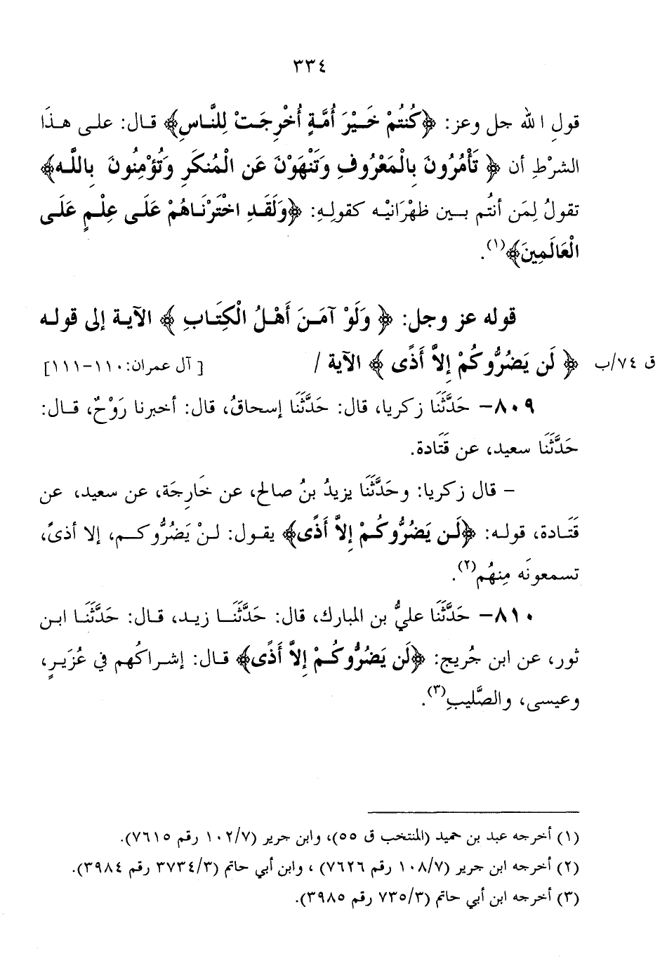 809 - حَدَّثَنَا زَكَرِيَّا، قَالَ: حَدَّثَنَا إِسْحَاق، قَالَ: أَخْبَرَنَا روح، قَالَ: حَدَّثَنَا سعيد، عَنْ قتادة، قَالَ زَكَرِيَّا وحدثنا يزيد بْن صالح، عَنْ خارجة، عَنْ سعيد، عَنْ قتادة، قوله: {لَنْ يَضُرُّوكُمْ إِلا أَذًى} يقول: " لن يضروكم إِلا أذى تسمعونه منهم "